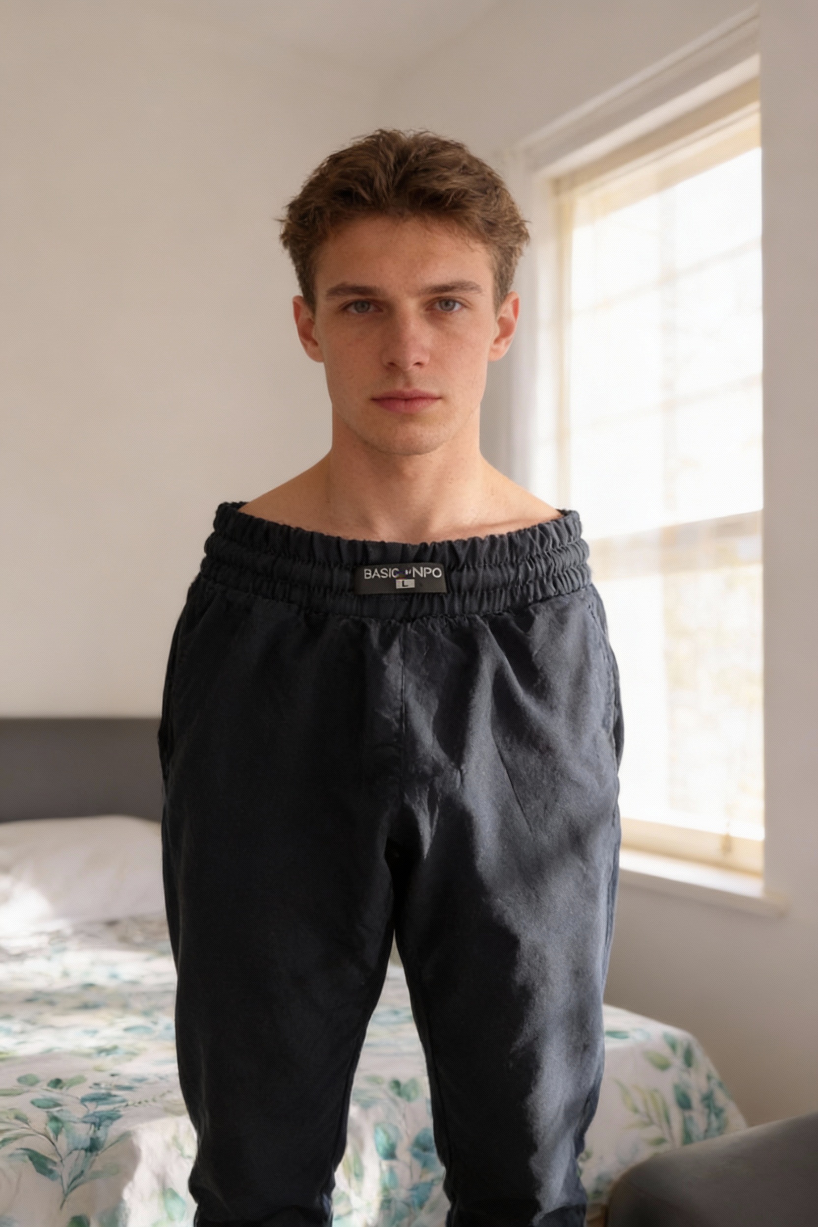 Bas Jogging NPO debout, face à la caméra, dans une chambre à la lumière douce, avec une lumière naturelle filtrant par la fenêtre.