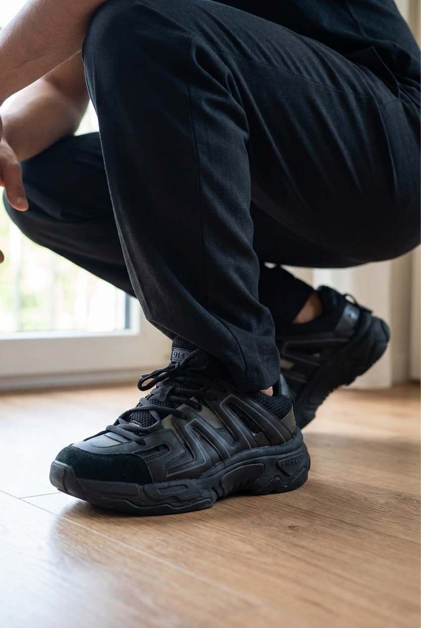 Une personne en Basket Diesel Homme accroupi élégamment pour montrer le tombé et le mouvement du vêtement, dans une chambre à la lumière douce, avec une lumière naturelle filtrant par la fenêtre.
