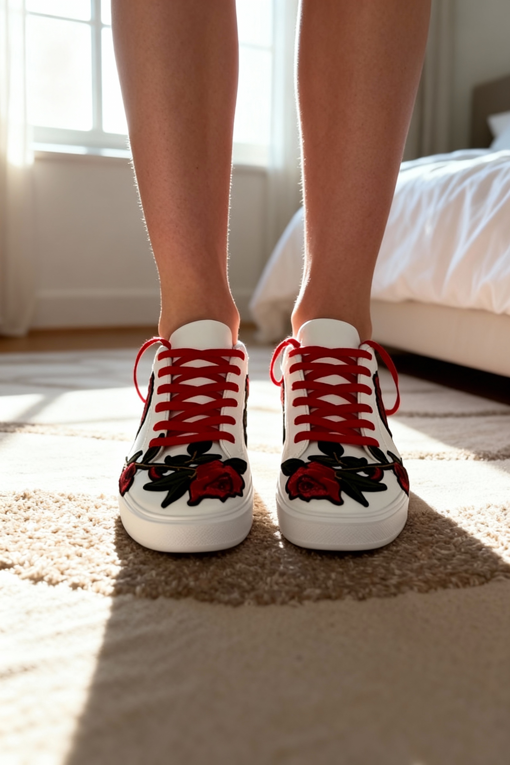 Baskets custom brodées roses rouges – modèle unique debout, face à la caméra, dans une chambre à la lumière douce, avec une lumière naturelle filtrant par la fenêtre.