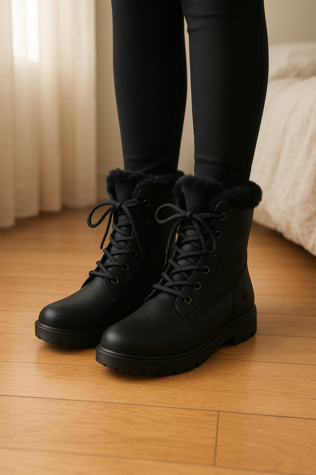 Baskets montantes Lacoste noires debout, face à la caméra, dans une chambre à la lumière douce, avec une lumière naturelle filtrant par la fenêtre.