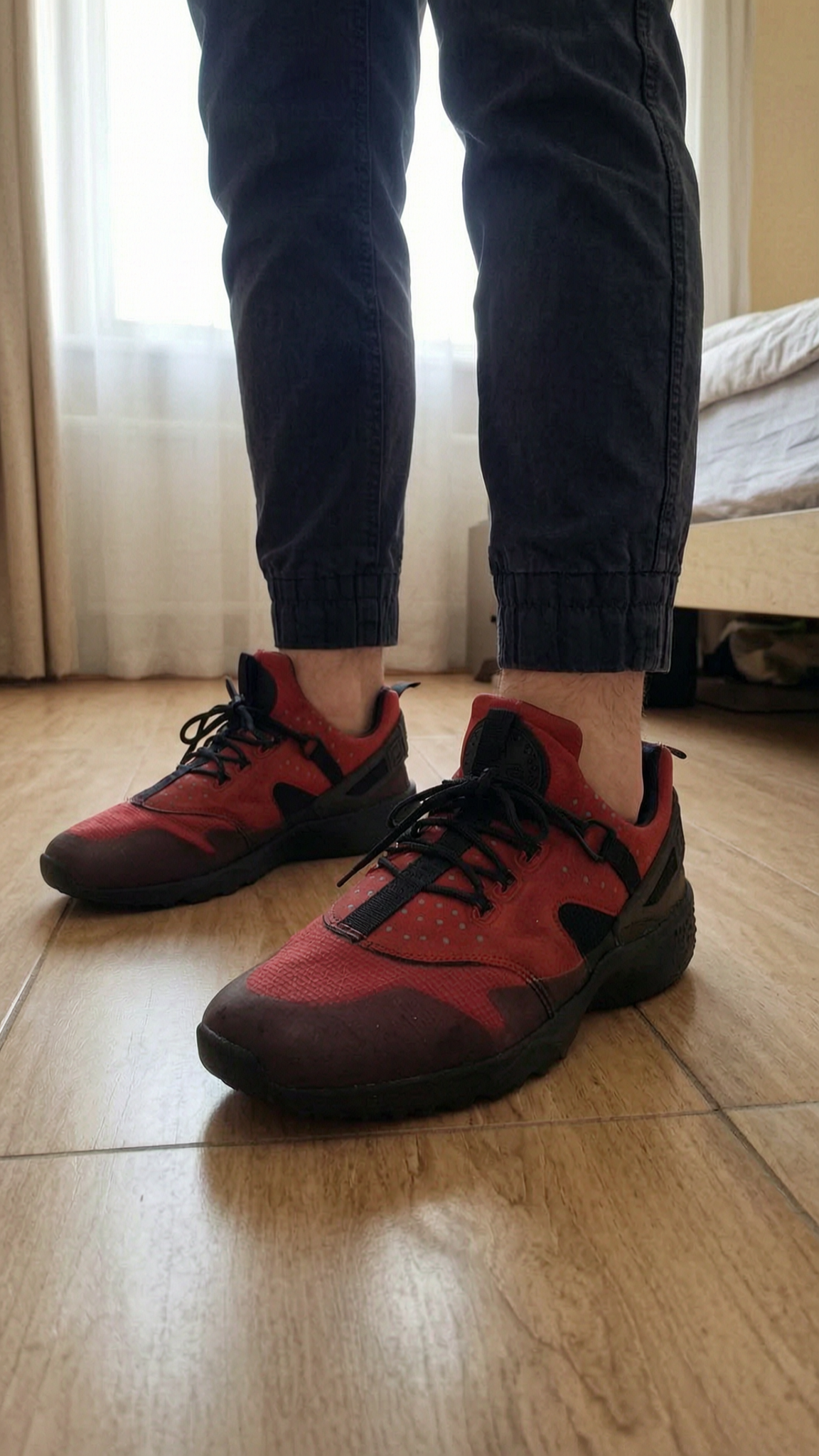 Baskets Nike Air debout, face à la caméra, dans une chambre à la lumière douce, avec une lumière naturelle filtrant par la fenêtre.
