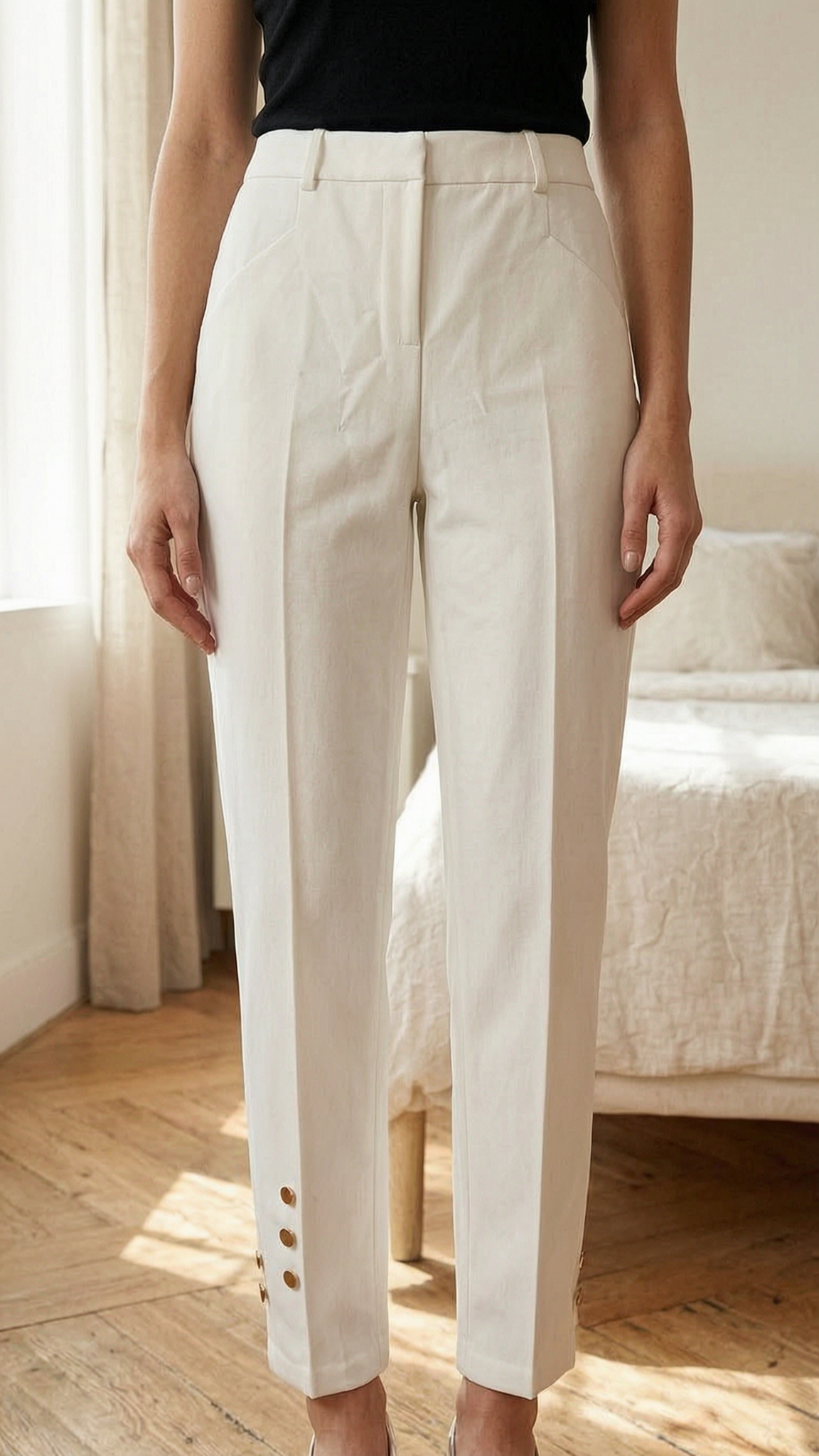 Beau pantalon Marciano by Guess, taille XS, it 38 debout, face à la caméra, dans une chambre à la lumière douce, avec une lumière naturelle filtrant par la fenêtre.