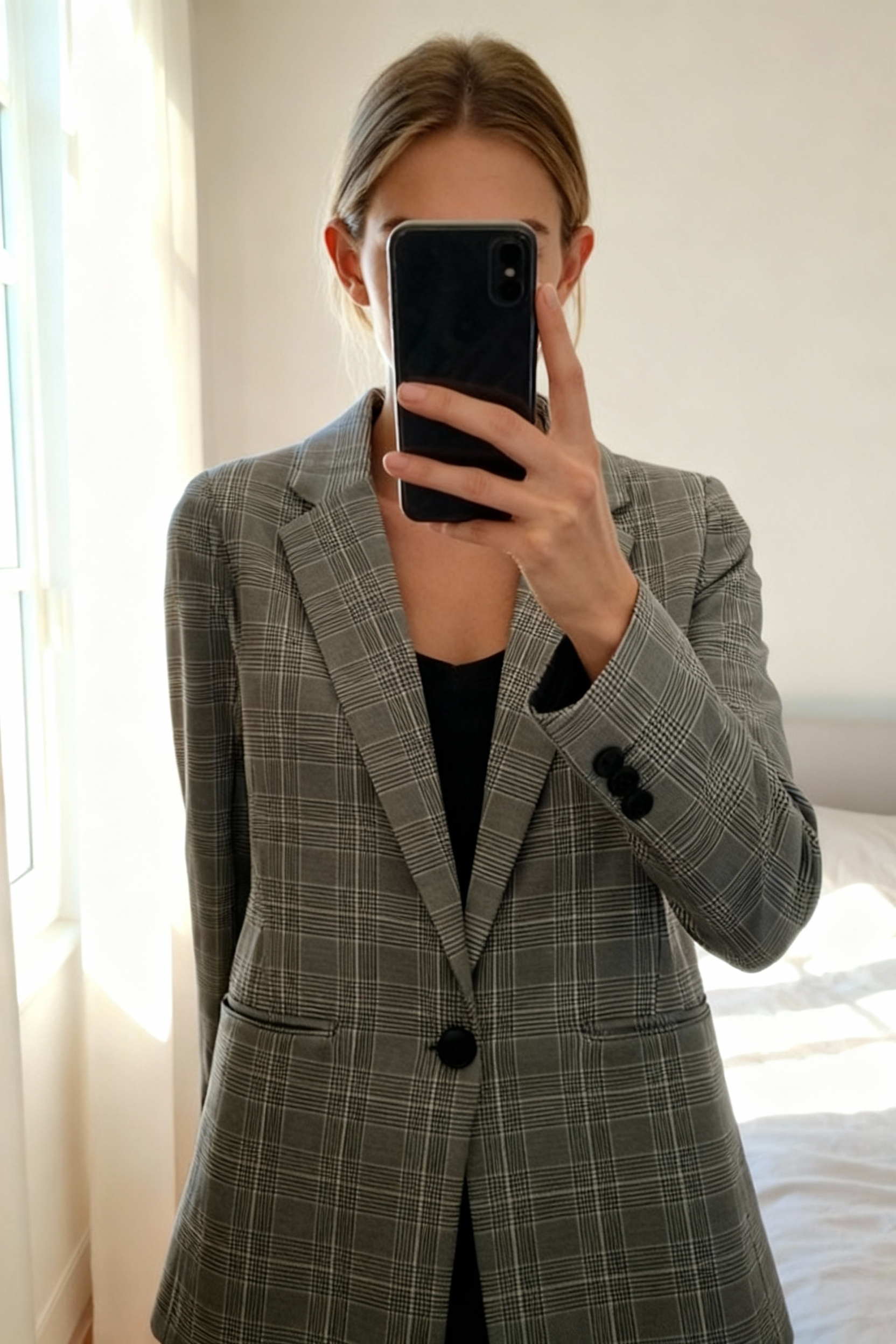 Blazer Bershka à carreaux debout, face à la caméra, dans une chambre à la lumière douce, avec une lumière naturelle filtrant par la fenêtre.