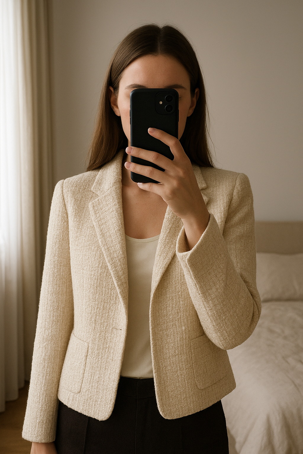 Blazer court Zara taille L debout, face à la caméra, dans une chambre à la lumière douce, avec une lumière naturelle filtrant par la fenêtre.