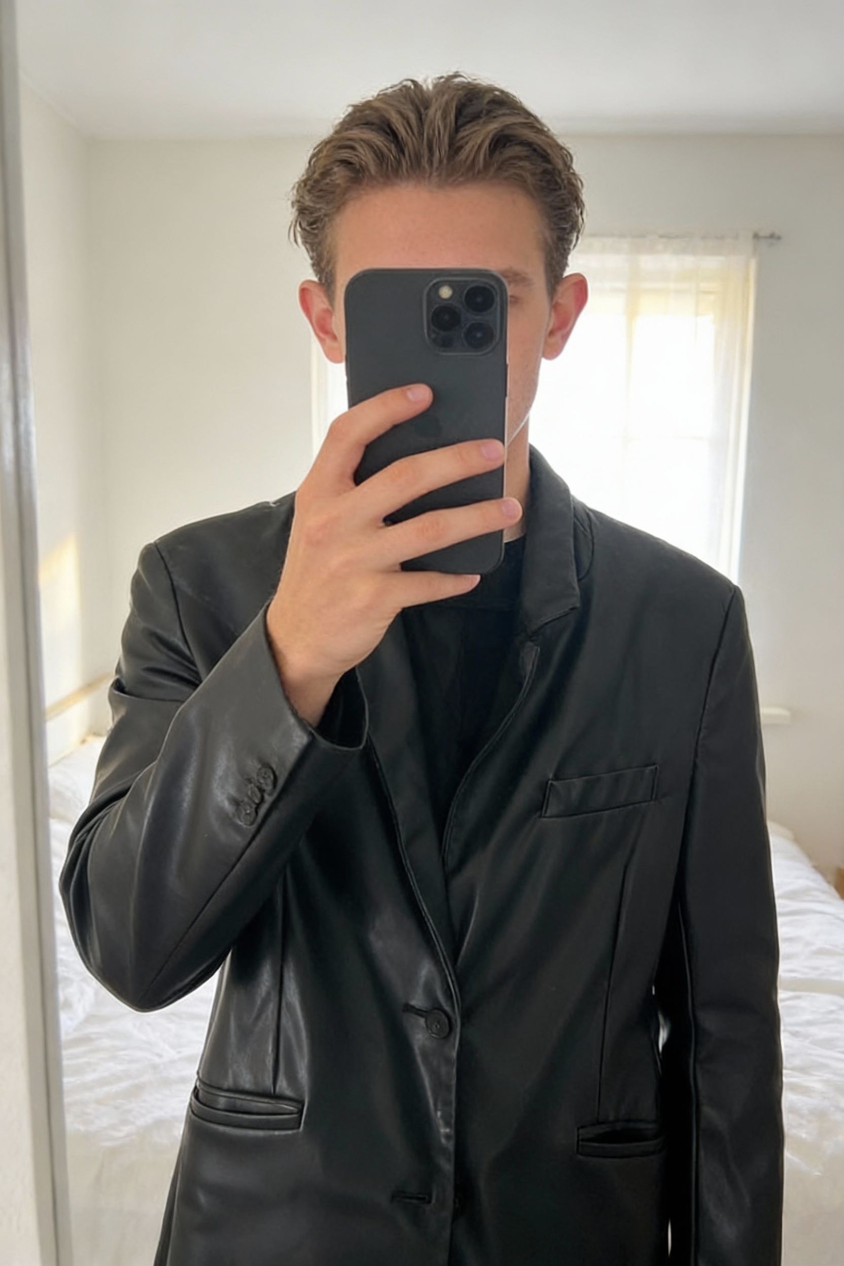 Blazer en cuir Bershka debout, face à la caméra, dans une chambre à la lumière douce, avec une lumière naturelle filtrant par la fenêtre.