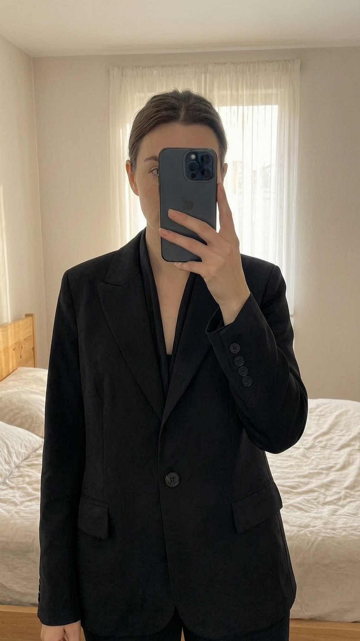 Blazer noir mango t. 46 debout, face à la caméra, dans une chambre à la lumière douce, avec une lumière naturelle filtrant par la fenêtre.