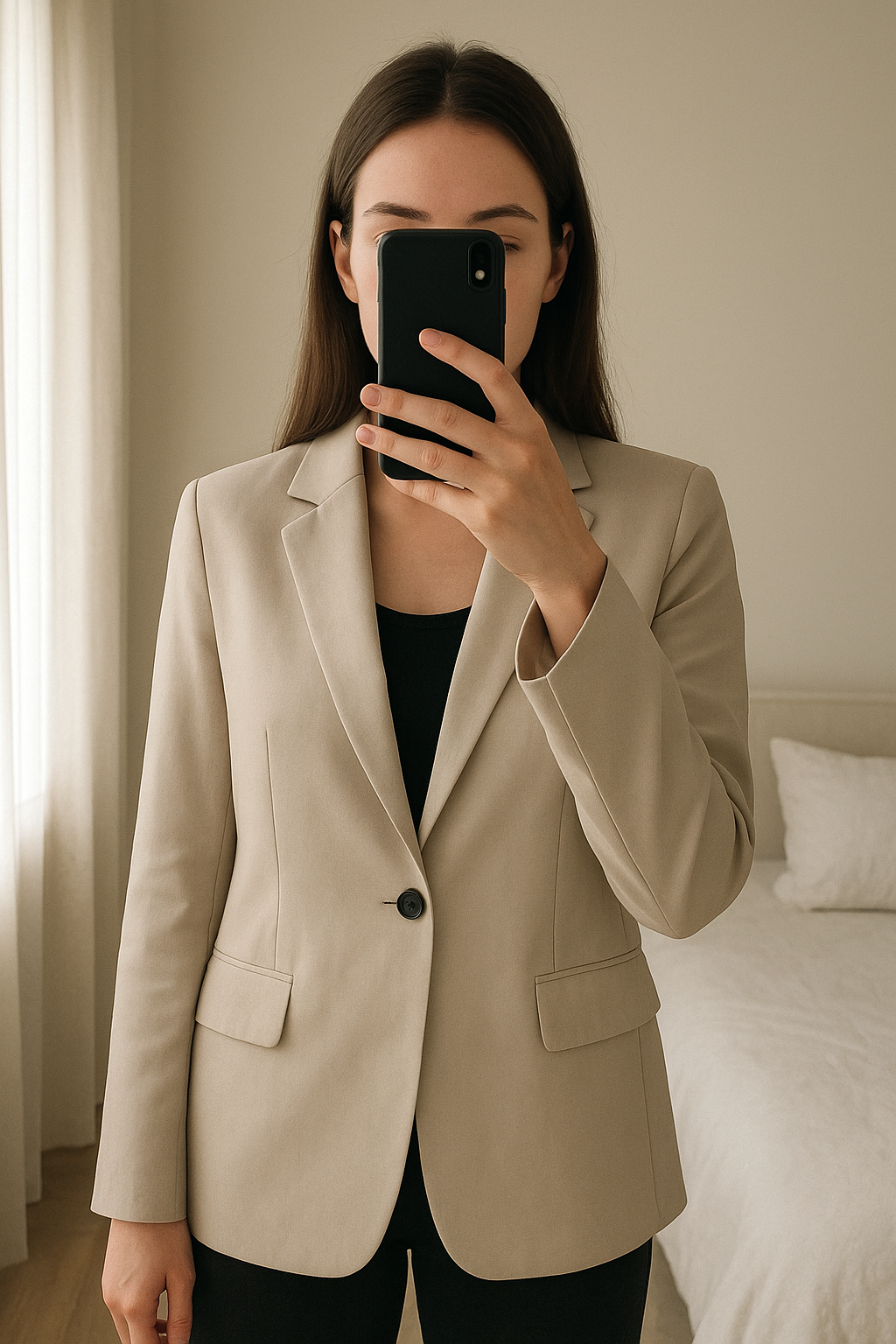 Blazer Oversize debout, face à la caméra, dans une chambre à la lumière douce, avec une lumière naturelle filtrant par la fenêtre.