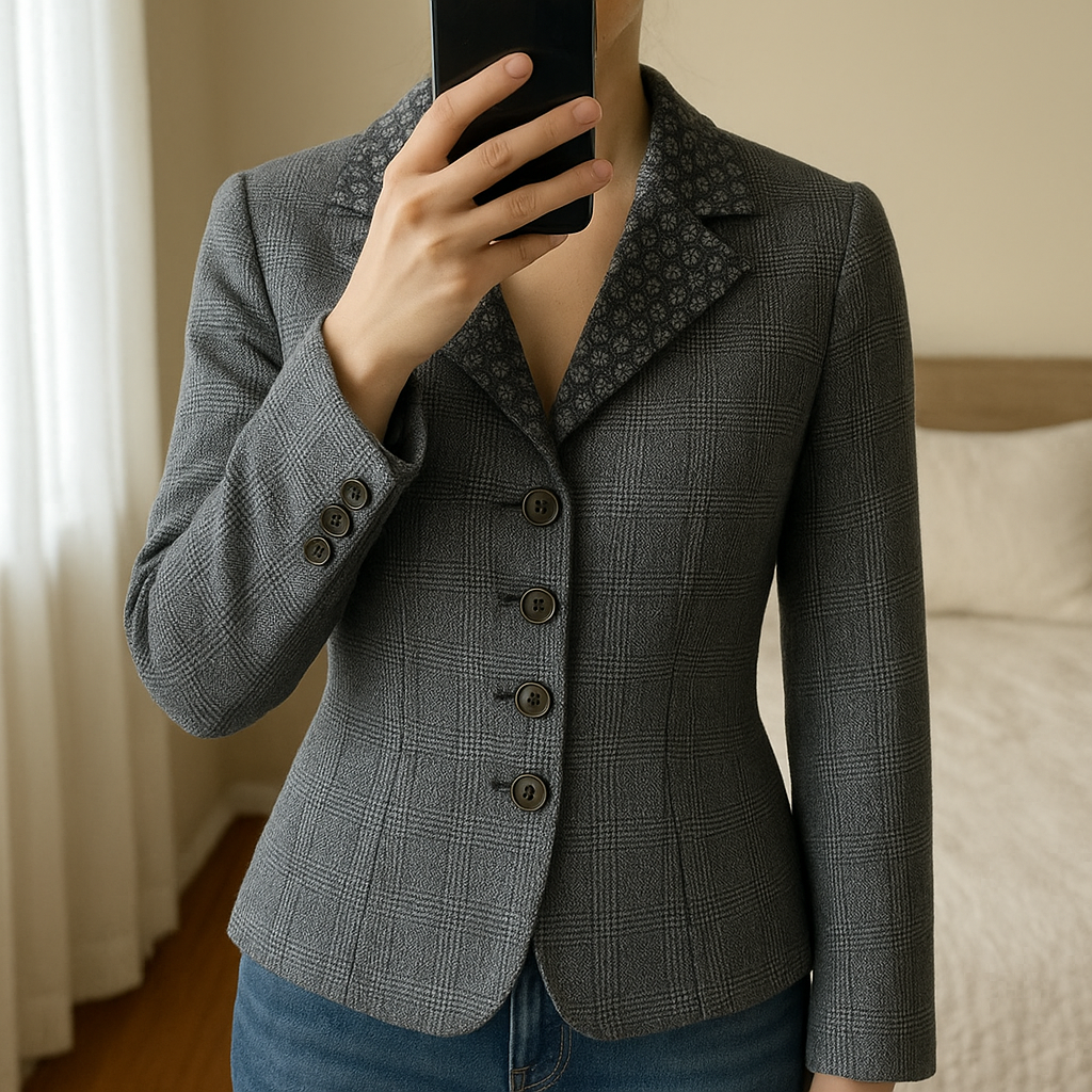Blazer y2k original femme taille S - wooxoom debout, face à la caméra, dans une chambre à la lumière douce, avec une lumière naturelle filtrant par la fenêtre.