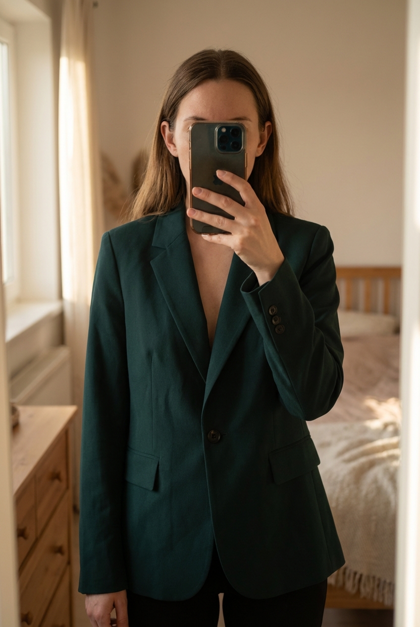 Blazer Zara vert taille 42 très bonne état debout, face à la caméra, dans une chambre à la lumière douce, avec une lumière naturelle filtrant par la fenêtre.