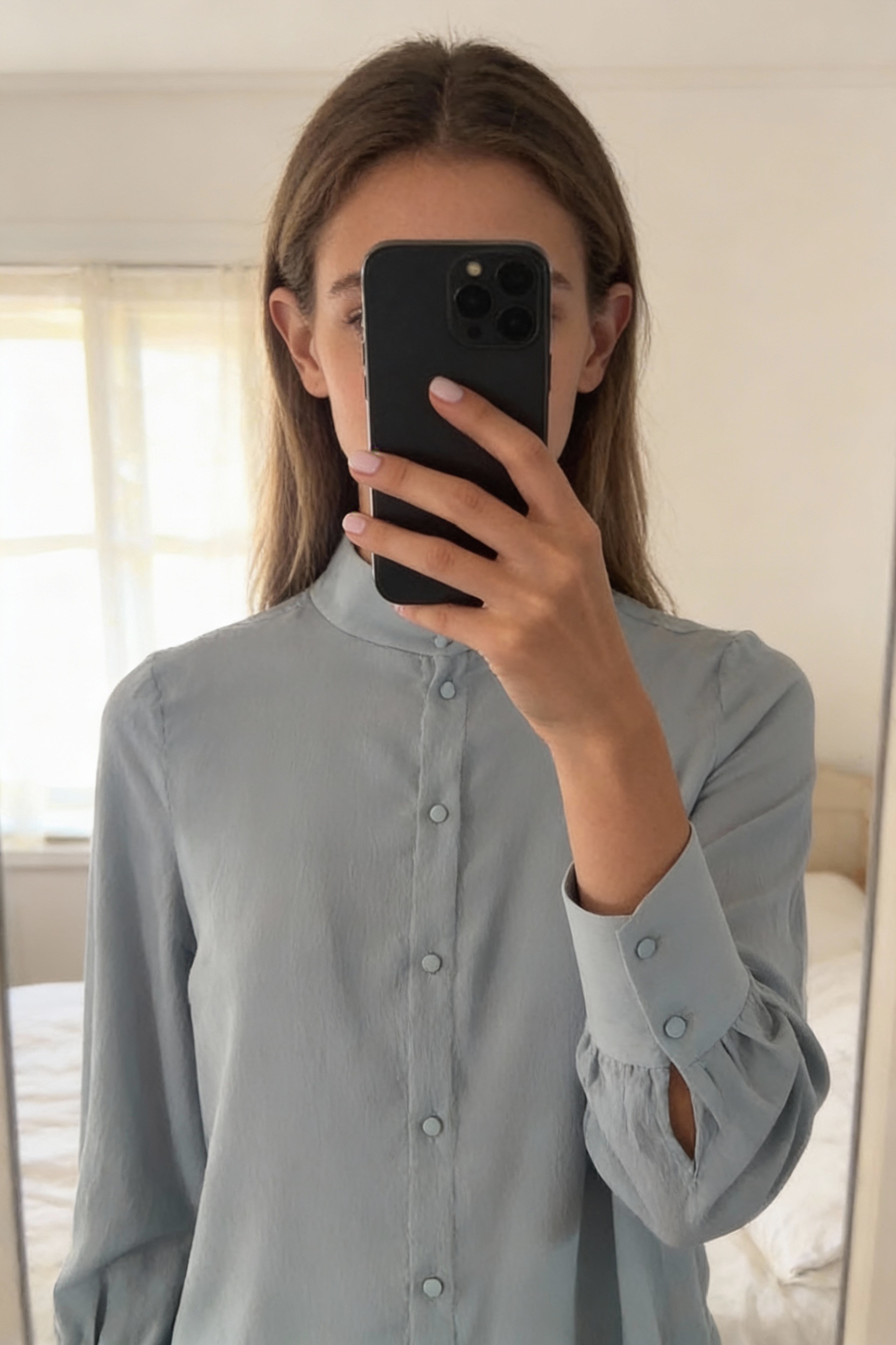 Blouse bleu/gris debout, face à la caméra, dans une chambre à la lumière douce, avec une lumière naturelle filtrant par la fenêtre.