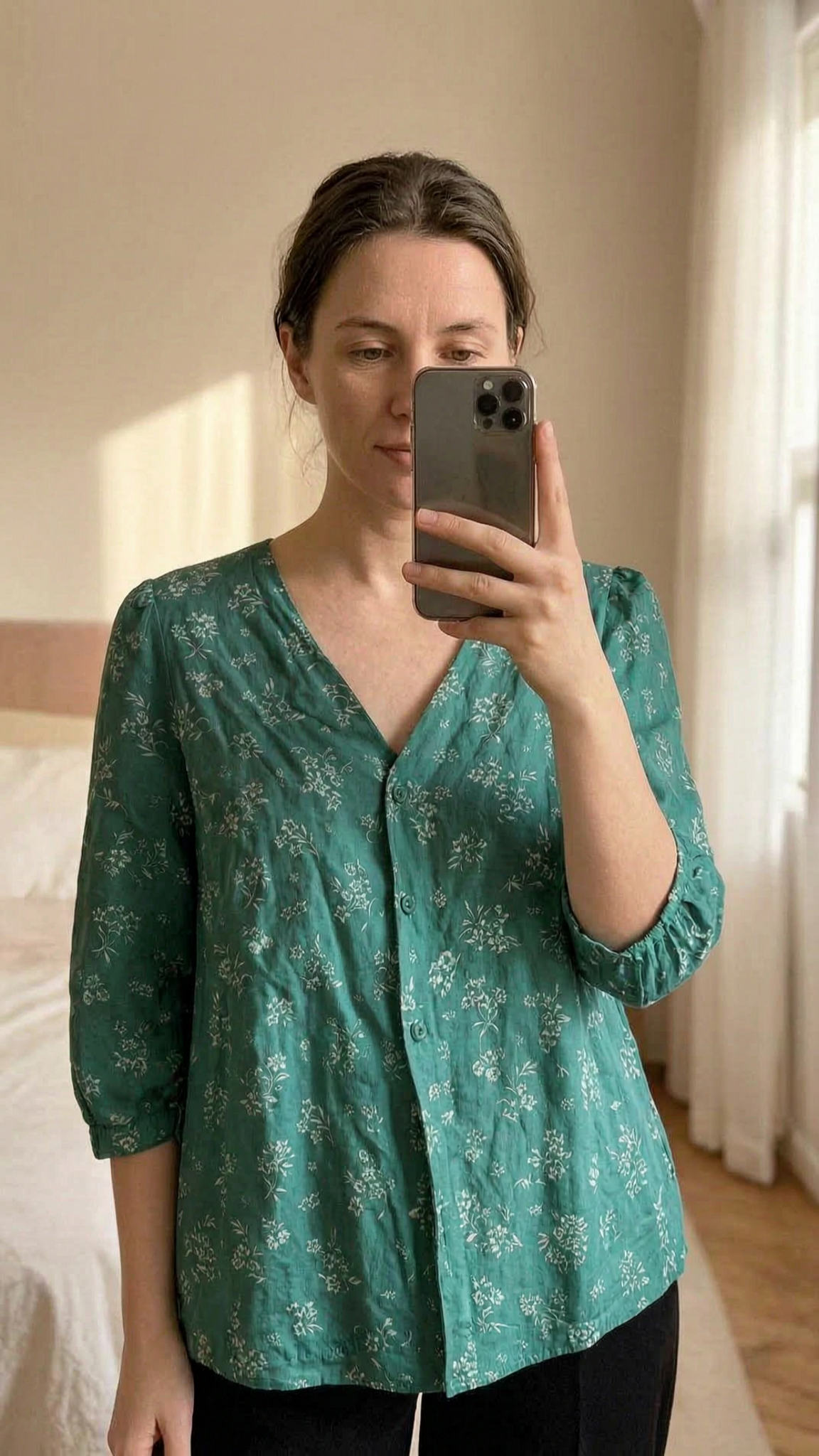 Blouse bleue turquoise fleurie grain de malice debout, face à la caméra, dans une chambre à la lumière douce, avec une lumière naturelle filtrant par la fenêtre.