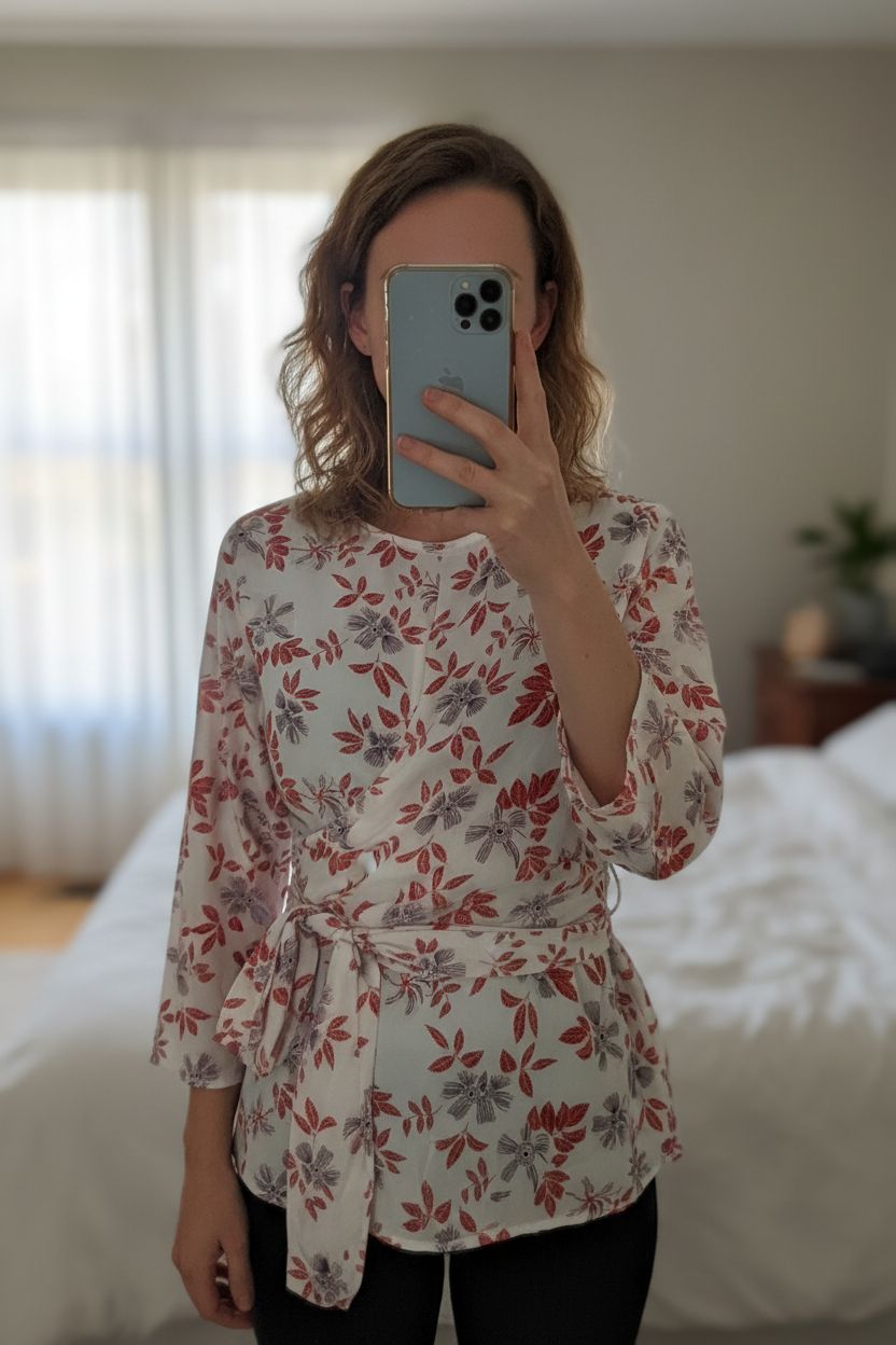 Blouse camaïeu debout, face à la caméra, dans une chambre à la lumière douce, avec une lumière naturelle filtrant par la fenêtre.