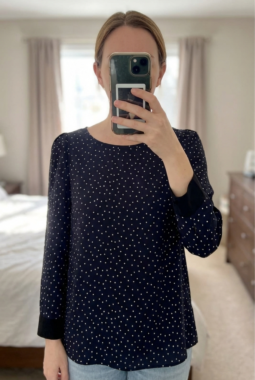 Une personne en Blouse Claudie Pierlot debout, face à la caméra, avec une silhouette fine, dans une chambre à la lumière douce, avec une lumière naturelle filtrant par la fenêtre.