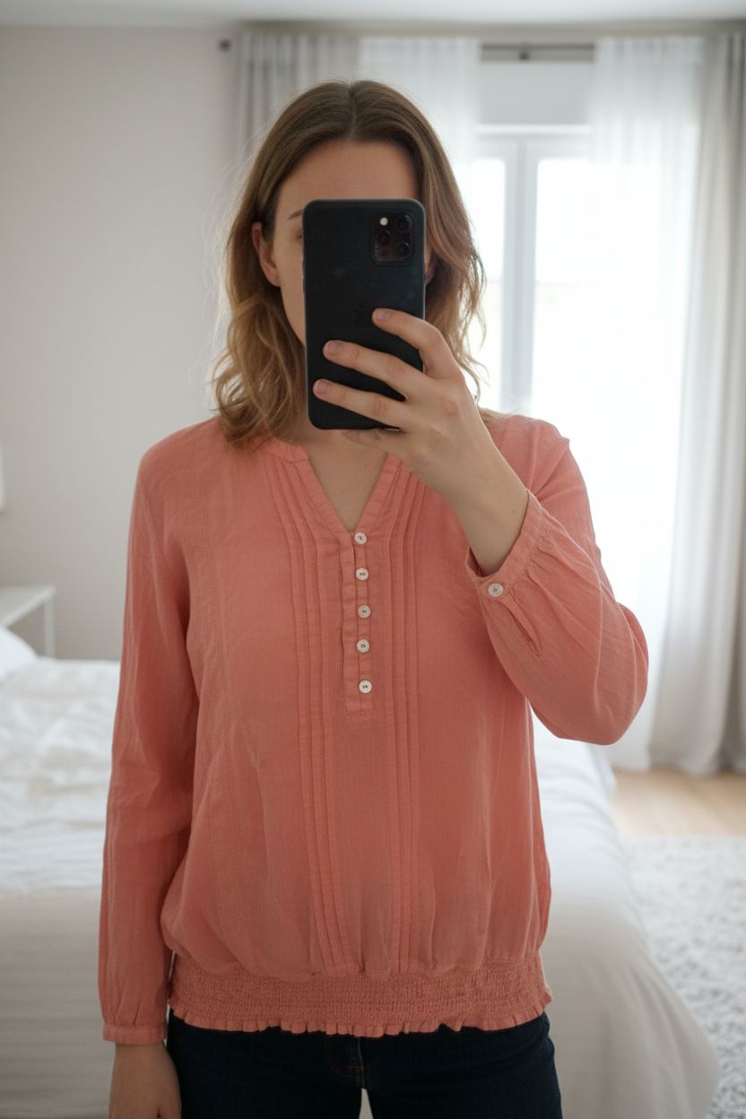 Blouse corail debout, face à la caméra, dans une chambre à la lumière douce, avec une lumière naturelle filtrant par la fenêtre.