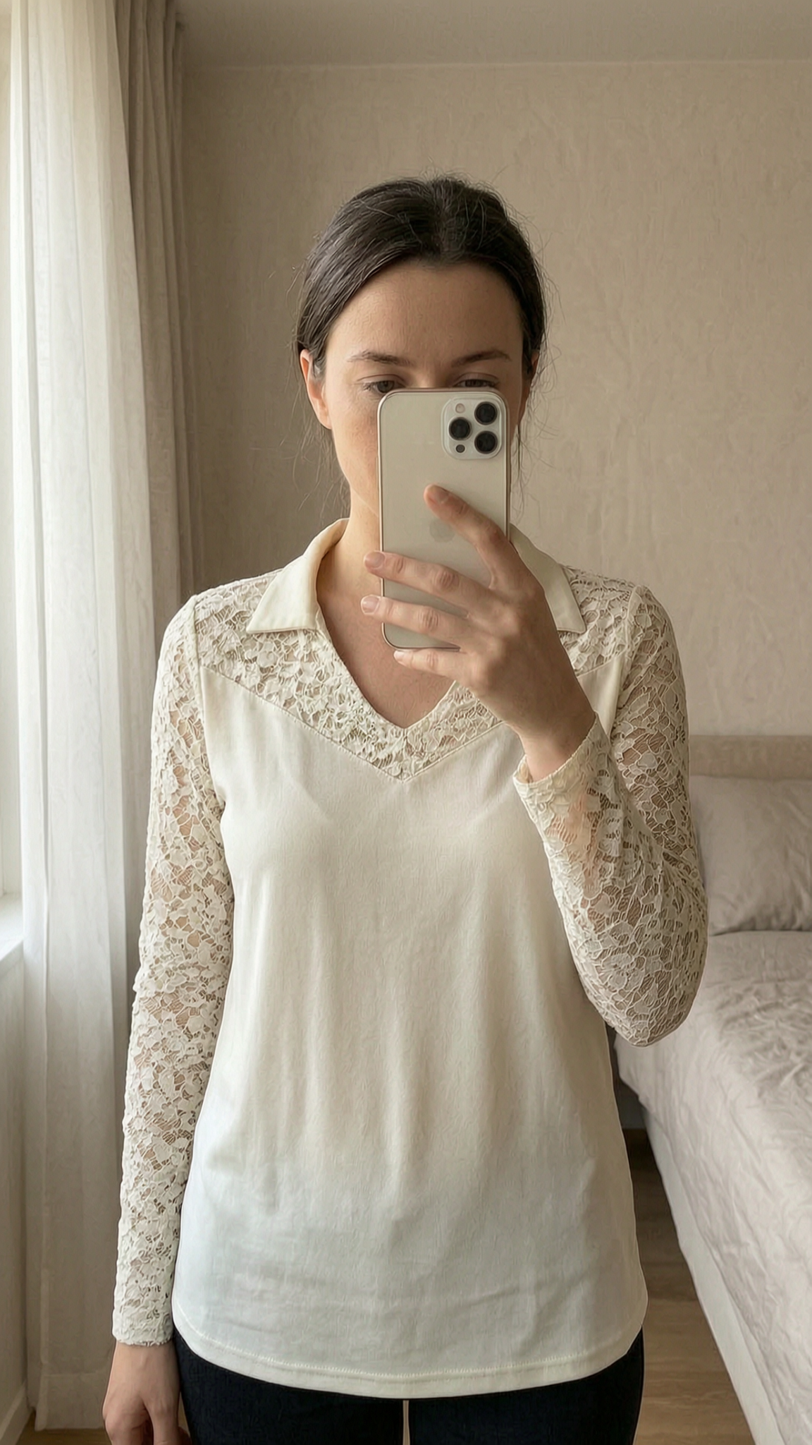 Blouse crème manches dentelle debout, face à la caméra, dans une chambre à la lumière douce, avec une lumière naturelle filtrant par la fenêtre.