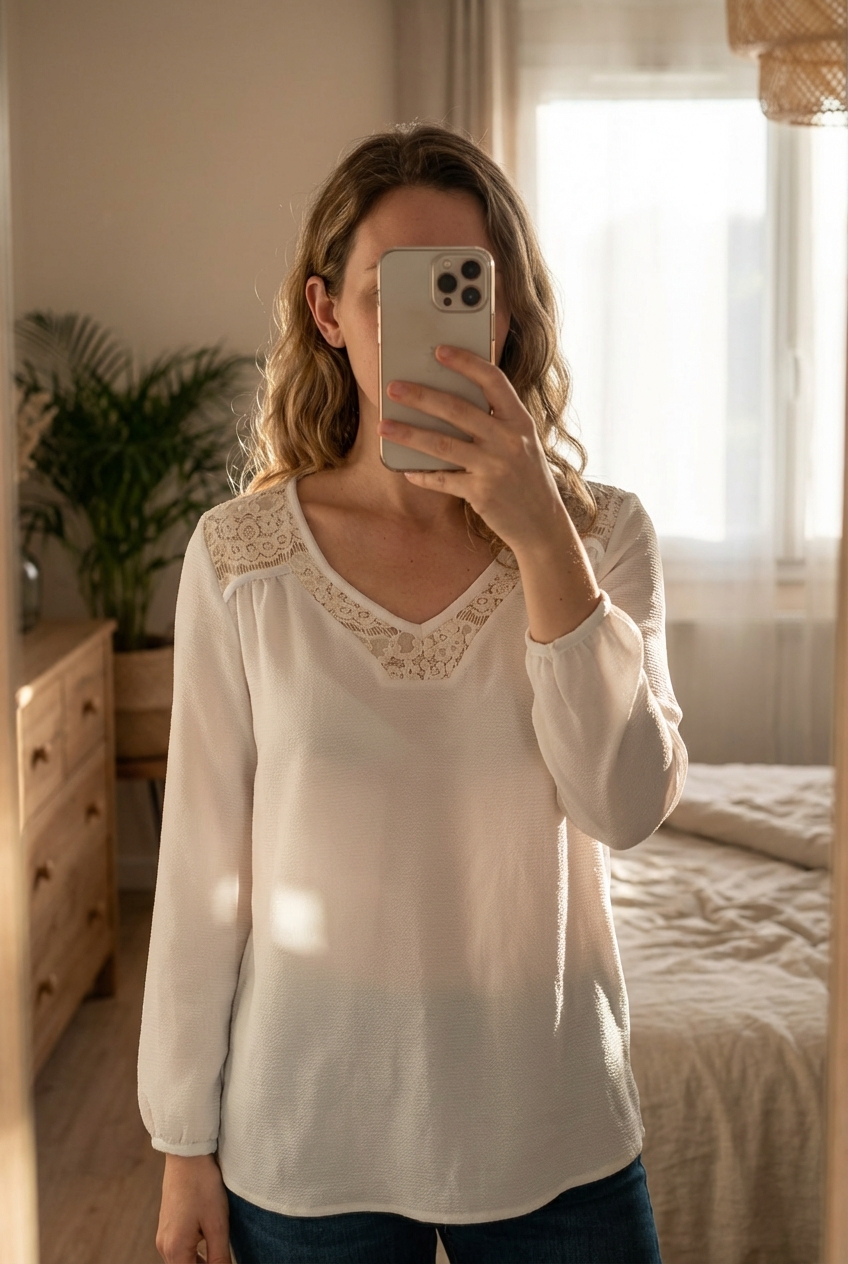 Blouse à dentelle debout, face à la caméra, dans une chambre à la lumière douce, avec une lumière naturelle filtrant par la fenêtre.
