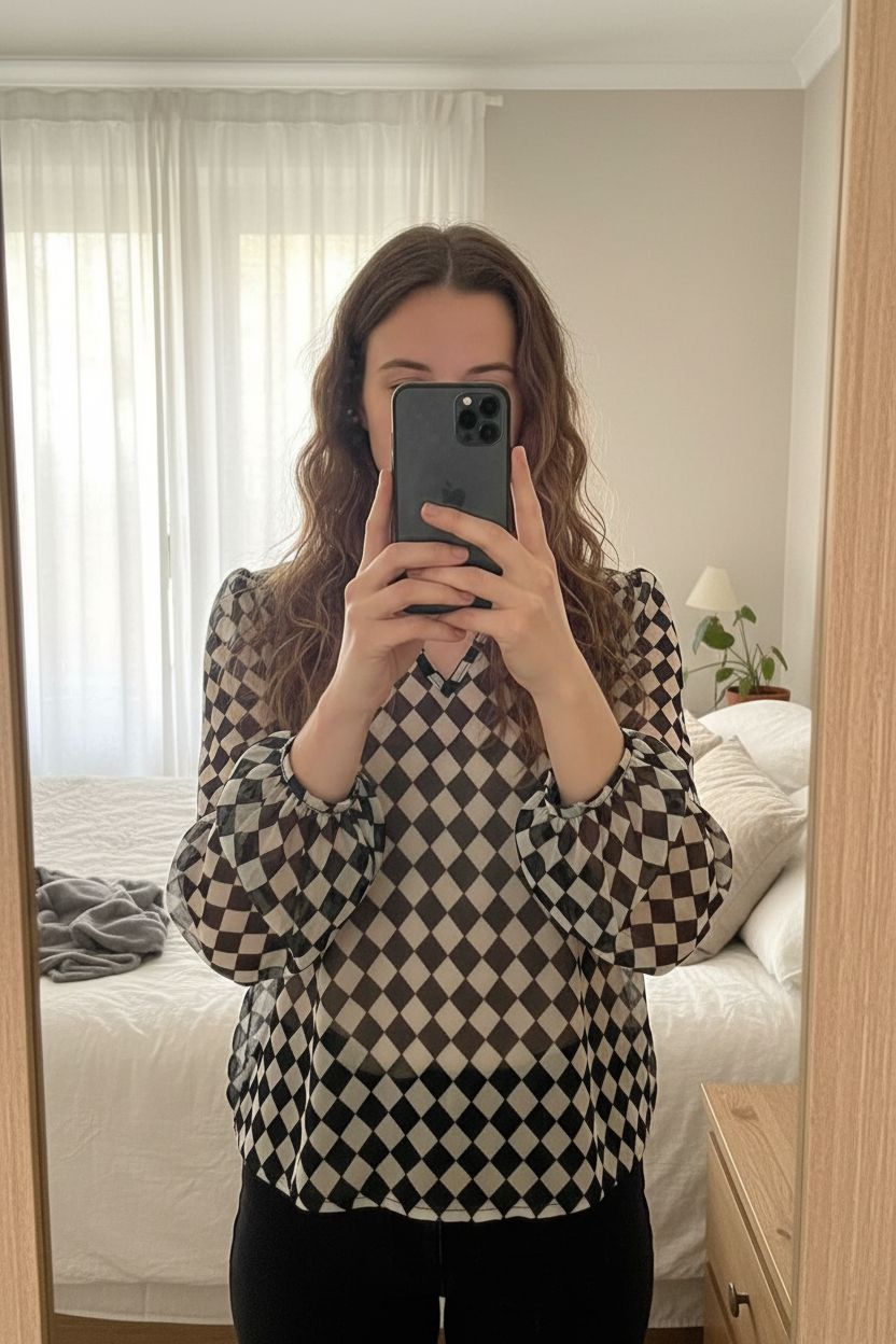 “Blouse fluide noire et crème à losanges – effet transparent – Taille L” debout, face à la caméra, dans une chambre à la lumière douce, avec une lumière naturelle filtrant par la fenêtre.