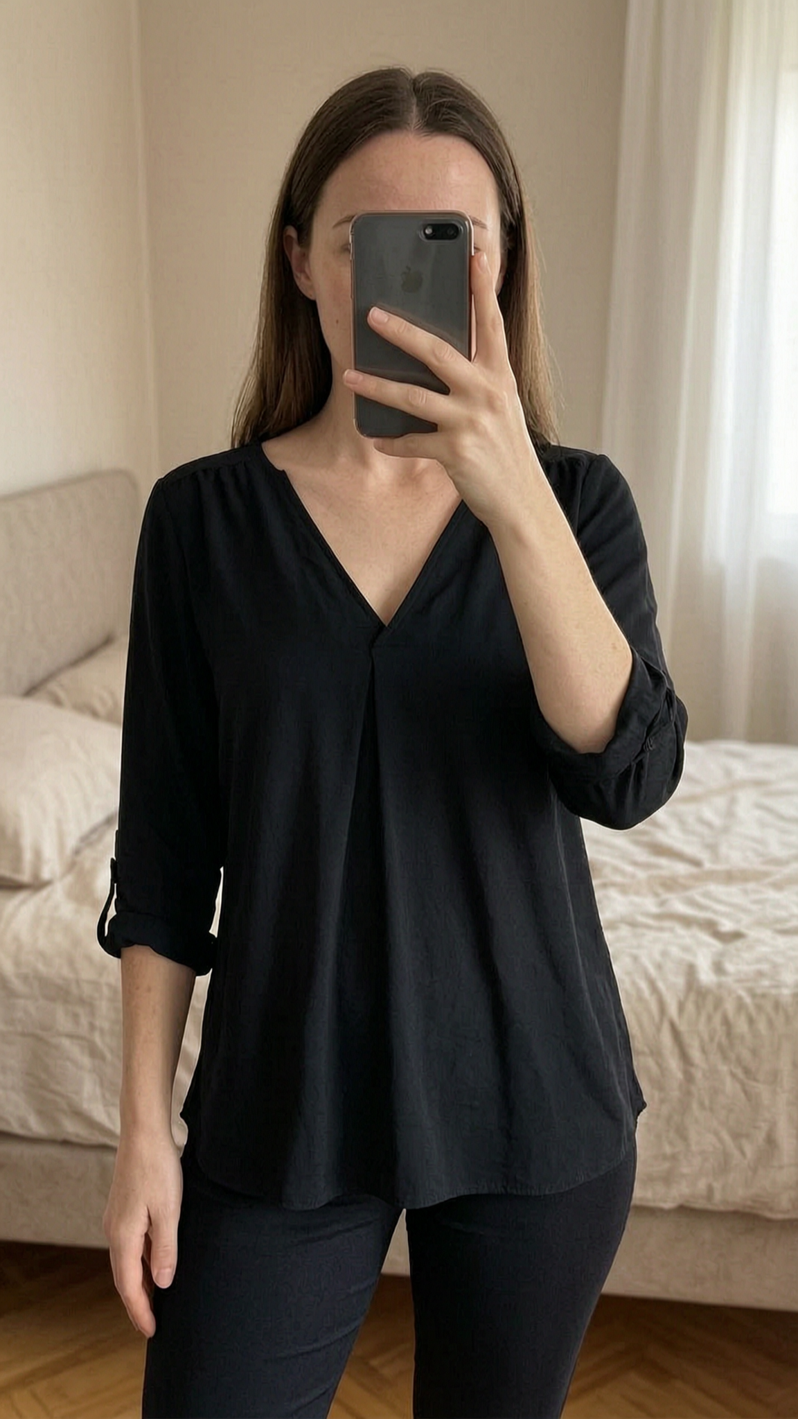 Blouse légère Taille M/L noire debout, face à la caméra, dans une chambre à la lumière douce, avec une lumière naturelle filtrant par la fenêtre.