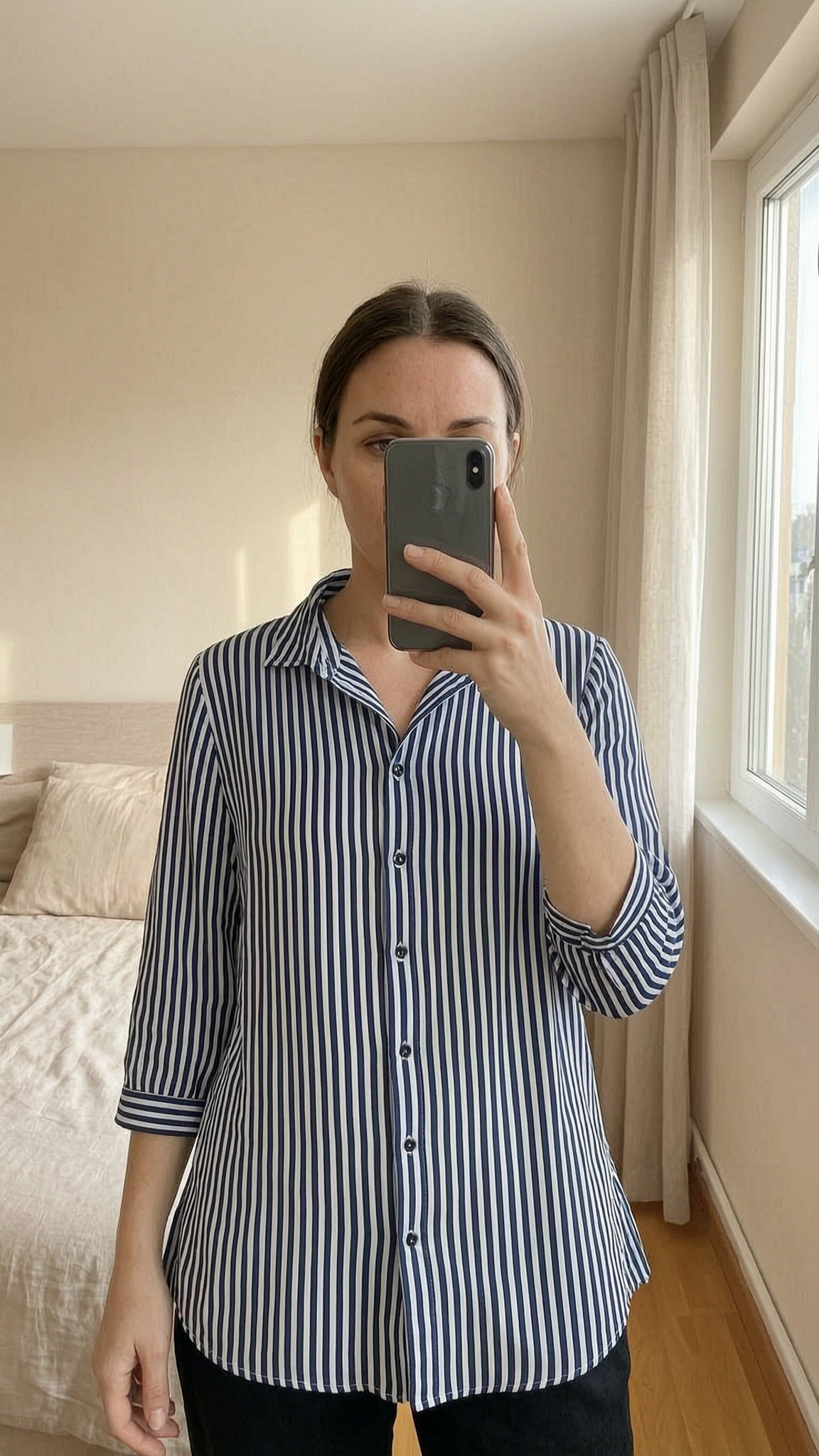 Blouse manches 3/4 a rayures Taille M/L debout, face à la caméra, dans une chambre à la lumière douce, avec une lumière naturelle filtrant par la fenêtre.