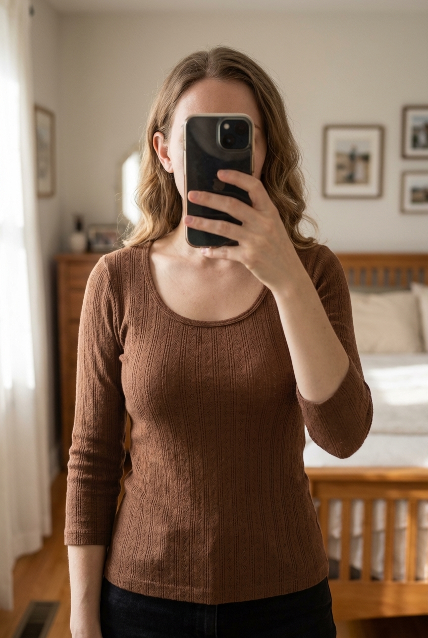 Blouse mi-saison manche 3/4 marron taille M debout, face à la caméra, dans une chambre à la lumière douce, avec une lumière naturelle filtrant par la fenêtre.