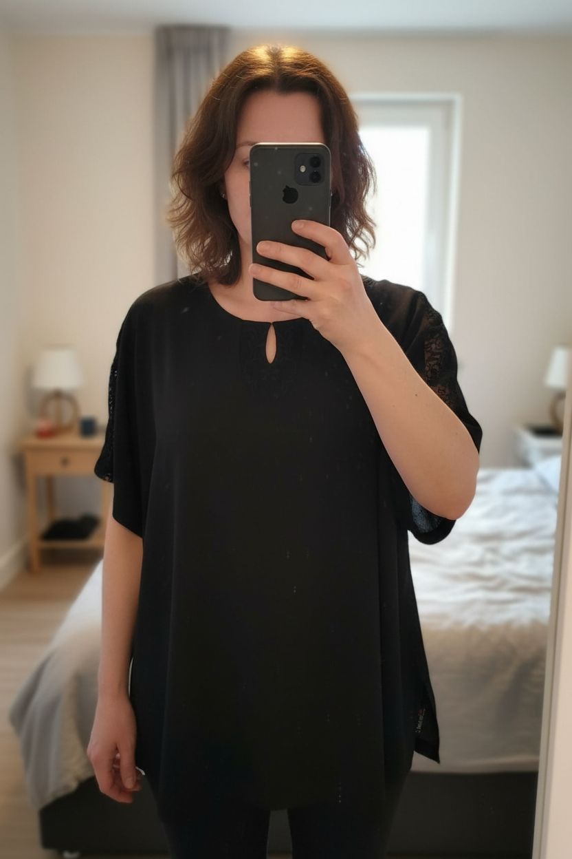 Blouse noire avec dentelle noire Taille 58/60, Marque Si Belle et debout, face à la caméra, dans une chambre à la lumière douce, avec une lumière naturelle filtrant par la fenêtre.