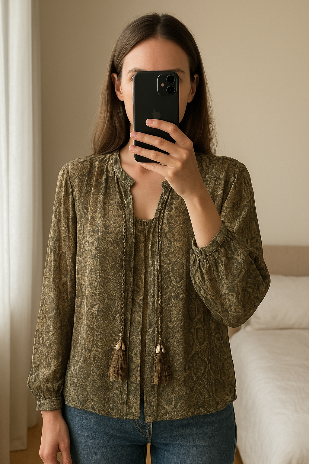 Blouse ouverte vert kaki motif python Zara T.M debout, face à la caméra, dans une chambre à la lumière douce, avec une lumière naturelle filtrant par la fenêtre.