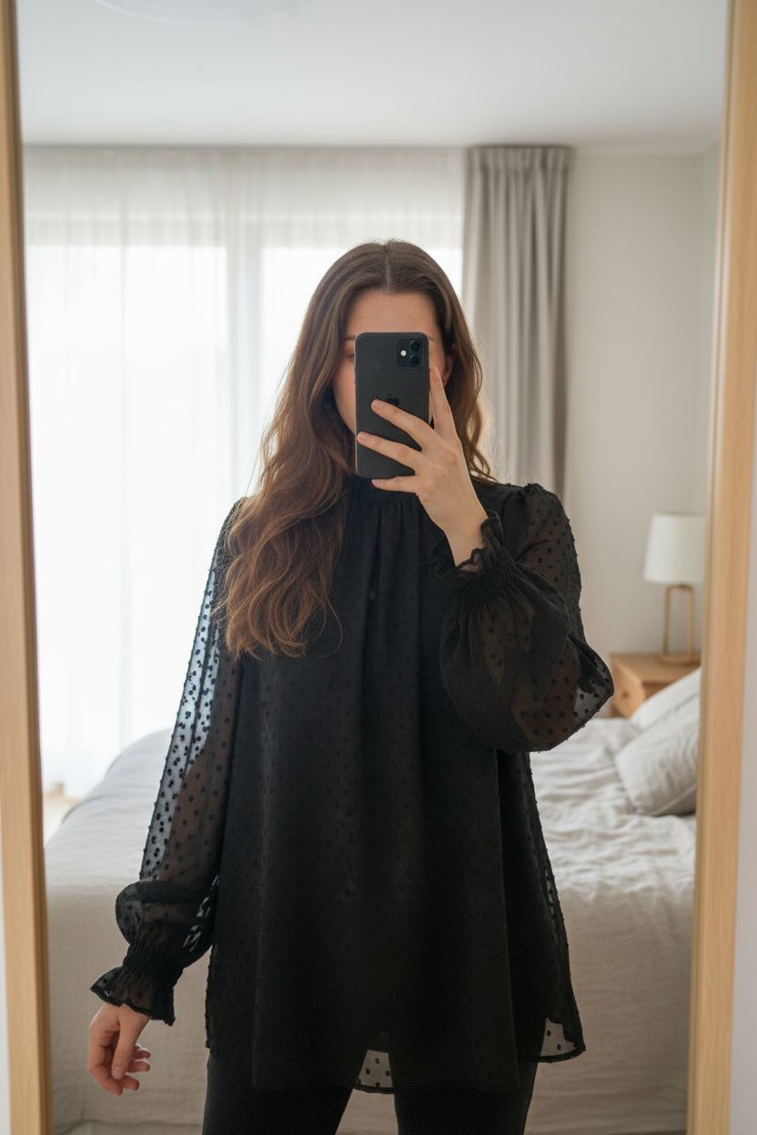Blouse à pois noir Shein debout, face à la caméra, dans une chambre à la lumière douce, avec une lumière naturelle filtrant par la fenêtre.