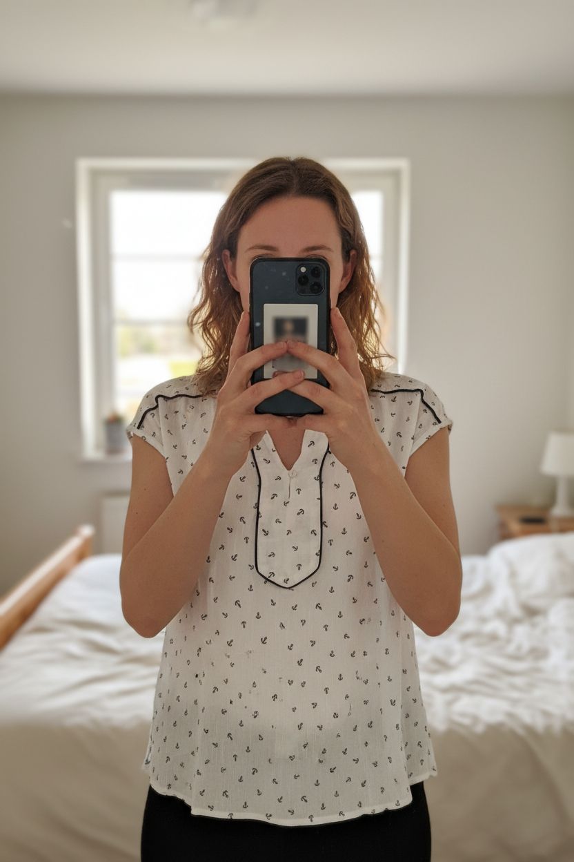 Blouse sans manche blanches scottage debout, face à la caméra, dans une chambre à la lumière douce, avec une lumière naturelle filtrant par la fenêtre.