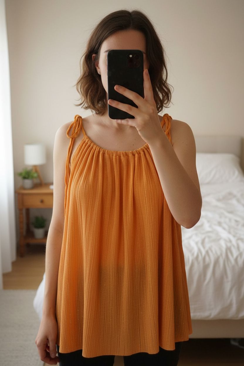 Blouse sans manches debout, face à la caméra, dans une chambre à la lumière douce, avec une lumière naturelle filtrant par la fenêtre.