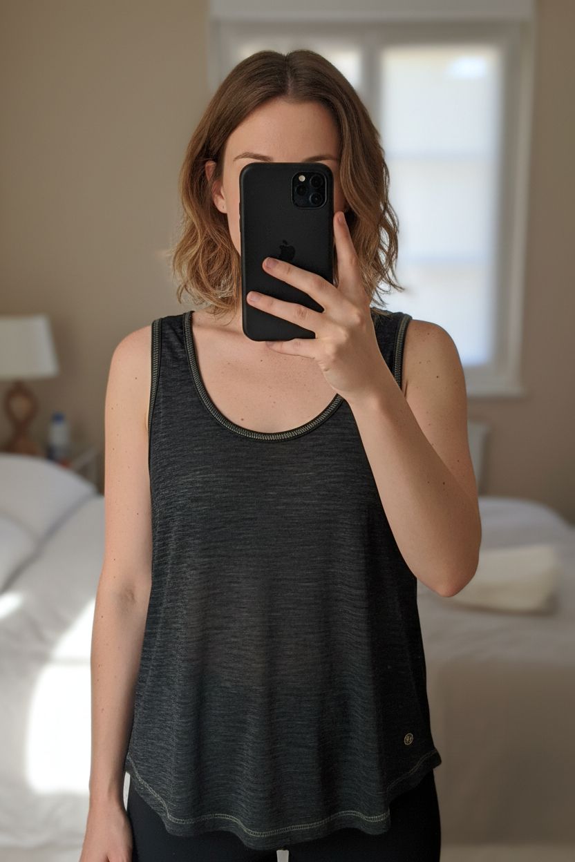 Blouse sans manches debout, face à la caméra, dans une chambre à la lumière douce, avec une lumière naturelle filtrant par la fenêtre.
