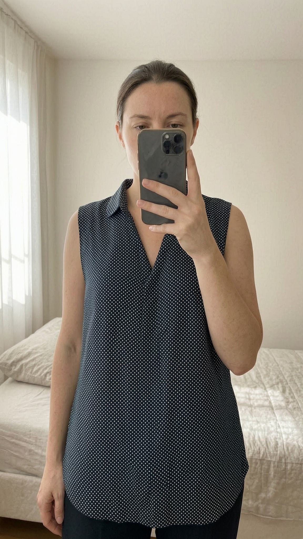 Blouse sans manches taille 44 debout, face à la caméra, dans une chambre à la lumière douce, avec une lumière naturelle filtrant par la fenêtre.
