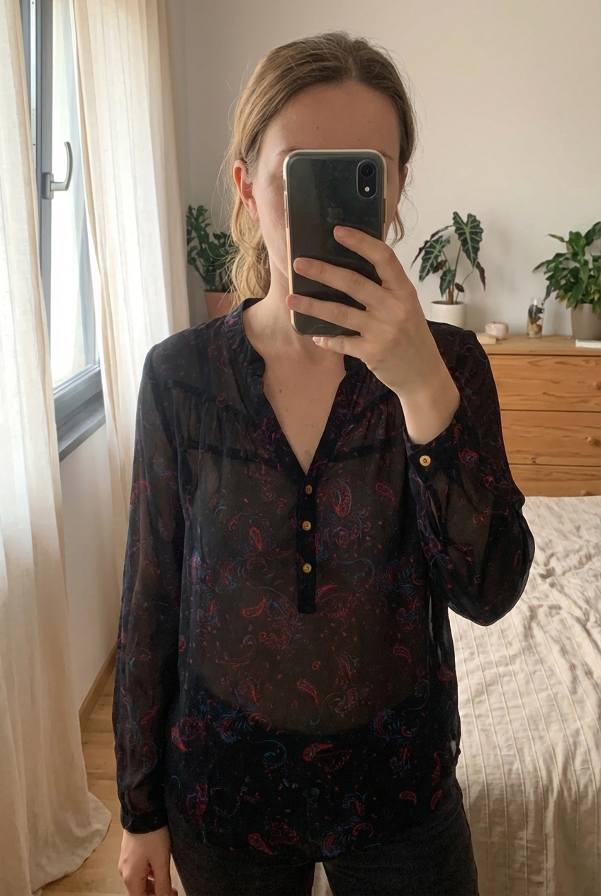 Blouse transparent noire à motifs S debout, face à la caméra, dans une chambre à la lumière douce, avec une lumière naturelle filtrant par la fenêtre.