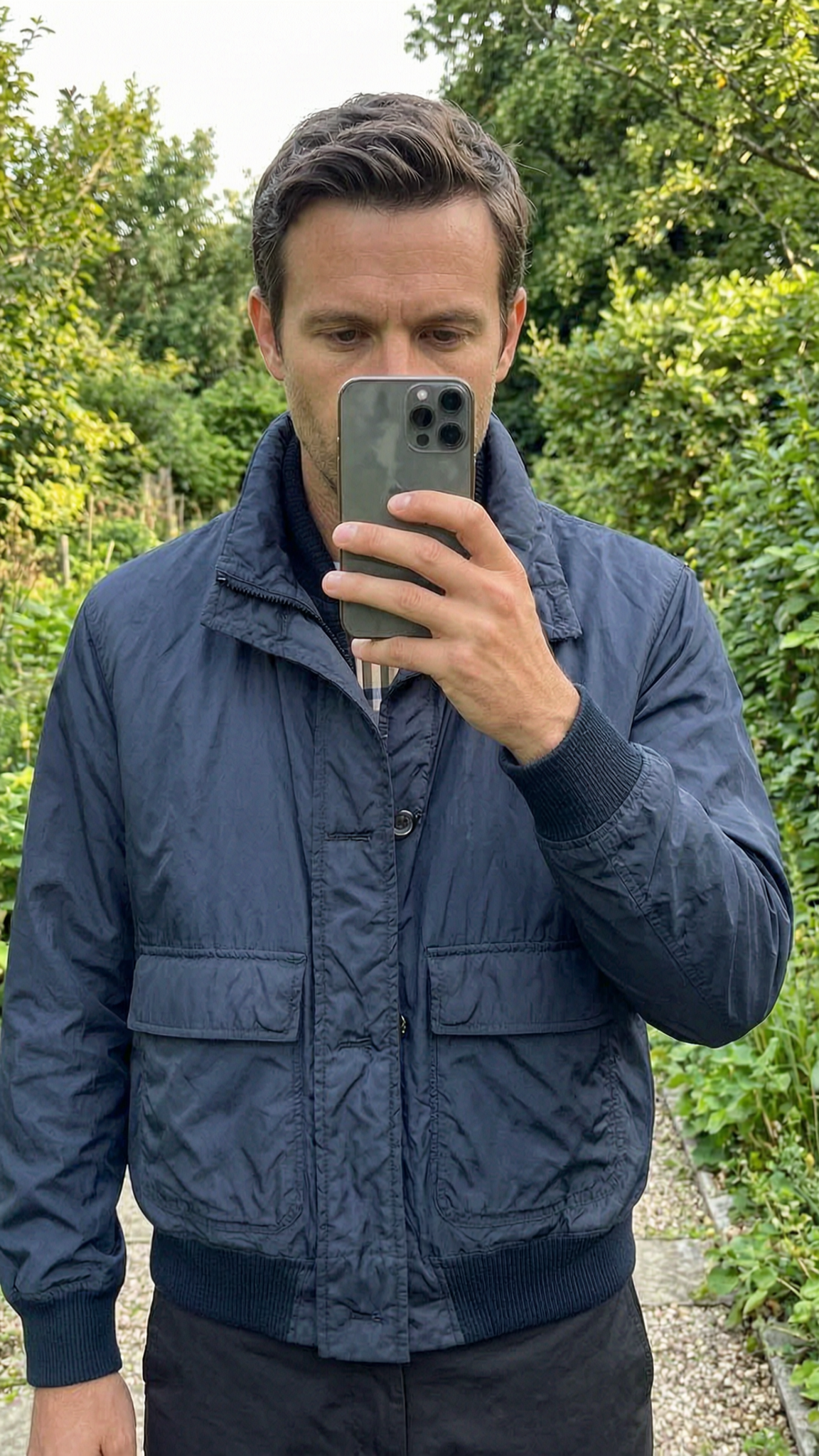 Une personne en Blouson Burberry Mi-saison 48 M debout, face à la caméra, en extérieur, dans un cadre naturel entouré de verdure et de lumière douce.