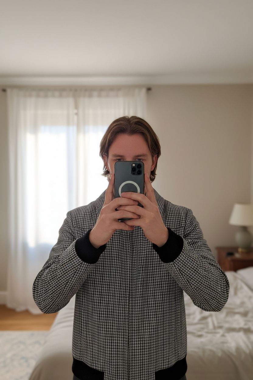 Blouson Dunhill London Homme - S – Luxe- Italien debout, face à la caméra, dans une chambre à la lumière douce, avec une lumière naturelle filtrant par la fenêtre.