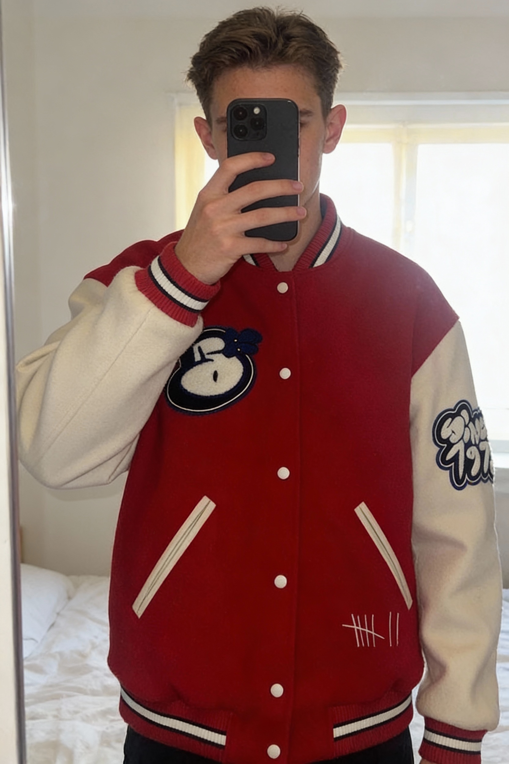 Blousons debout, face à la caméra, dans une chambre à la lumière douce, avec une lumière naturelle filtrant par la fenêtre.