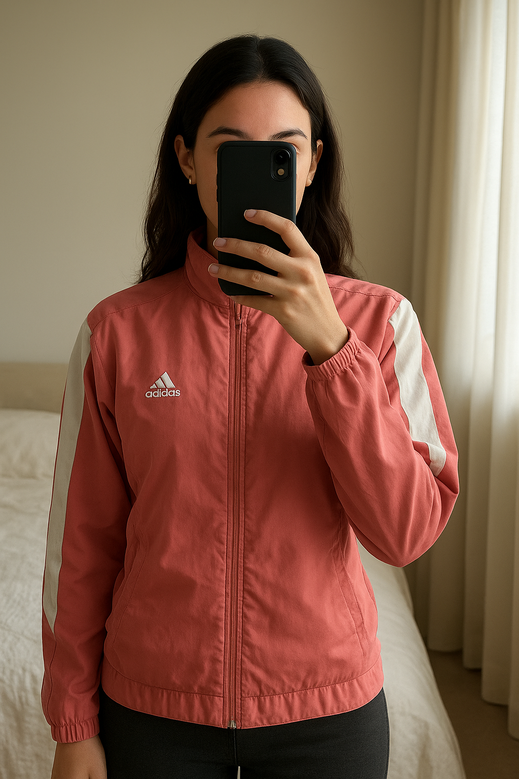 Bluza Adidas Dama standing straight facing the camera, in a softly lit bedroom setting, with gentle natural light filtering through a window.