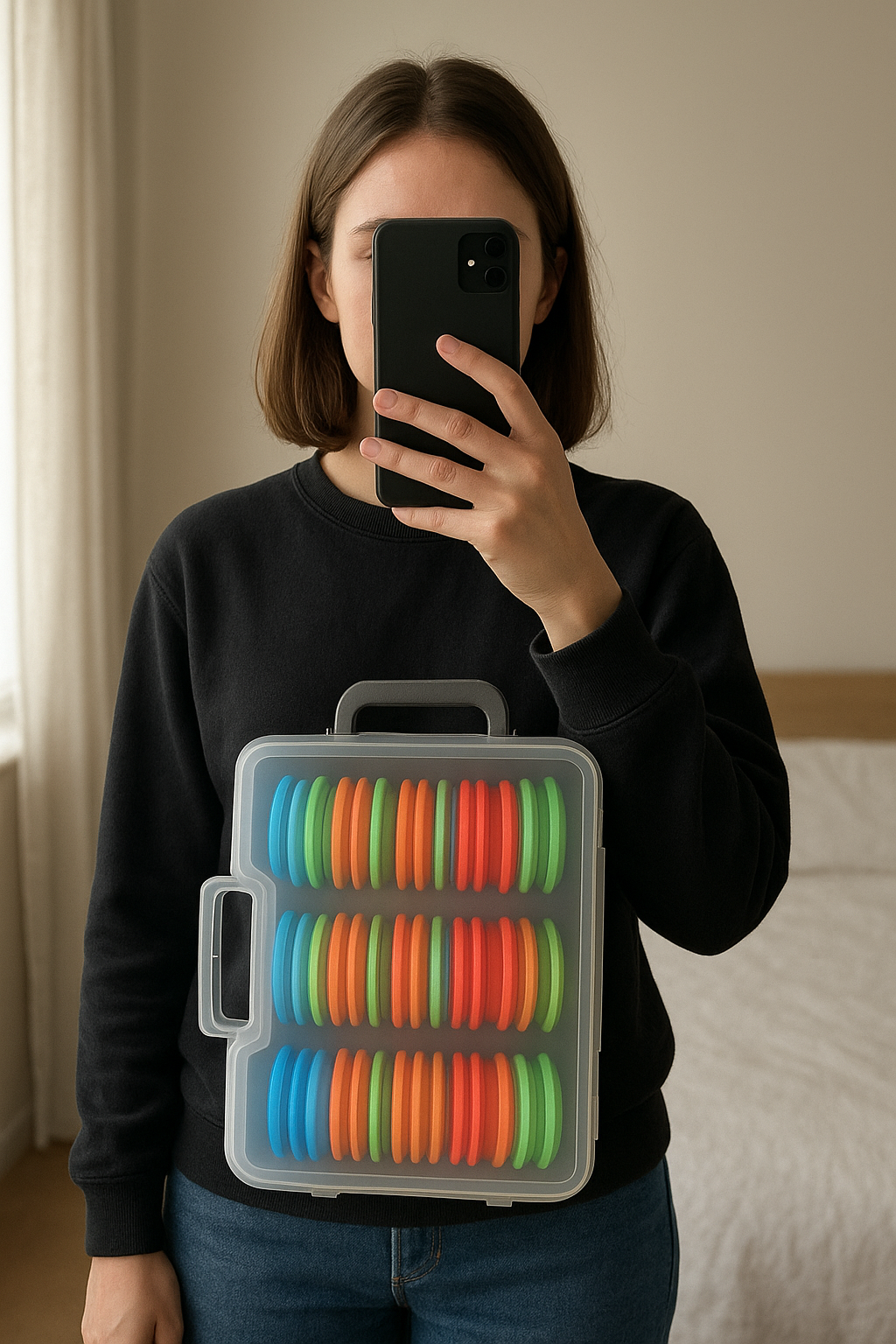 Boîte EVA x24 pour bas de ligne – Surfcasting / pêche en mer / carpe debout, face à la caméra, dans une chambre à la lumière douce, avec une lumière naturelle filtrant par la fenêtre.