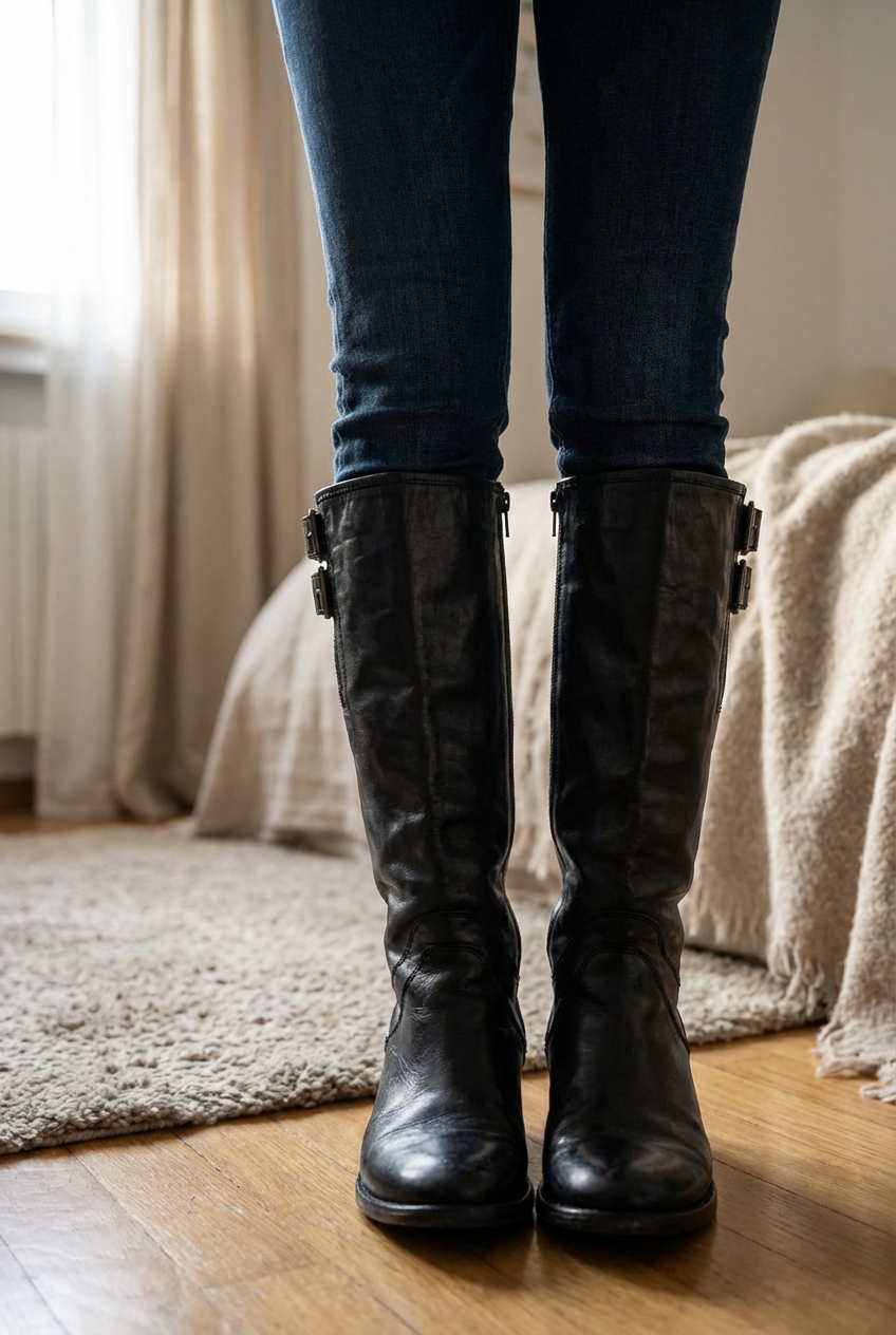 Bottes cuir debout, face à la caméra, dans une chambre à la lumière douce, avec une lumière naturelle filtrant par la fenêtre.