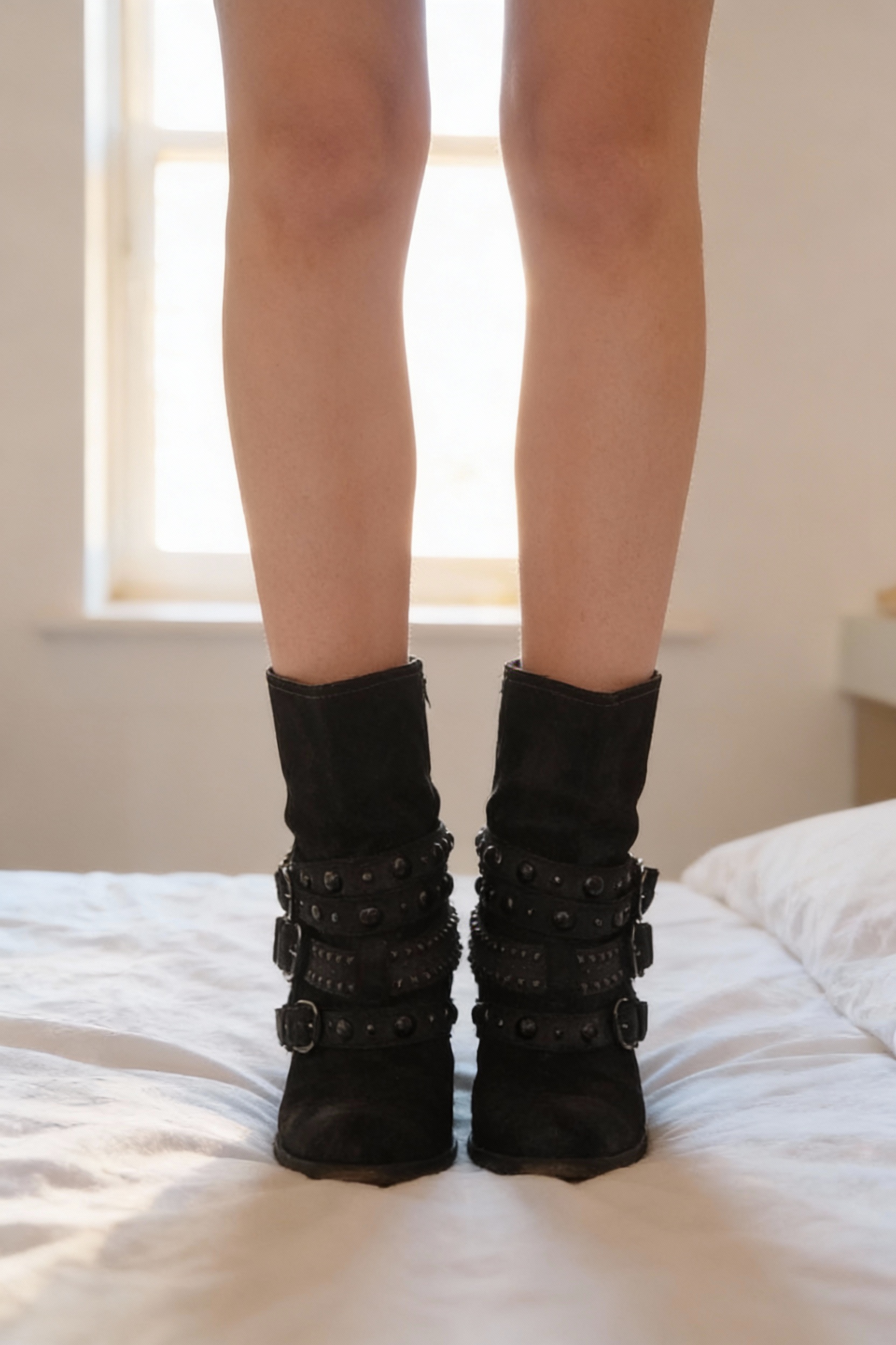 Bottes GUESS mi-hautes, cuir nubuck, Taille 36 debout, face à la caméra, dans une chambre à la lumière douce, avec une lumière naturelle filtrant par la fenêtre.