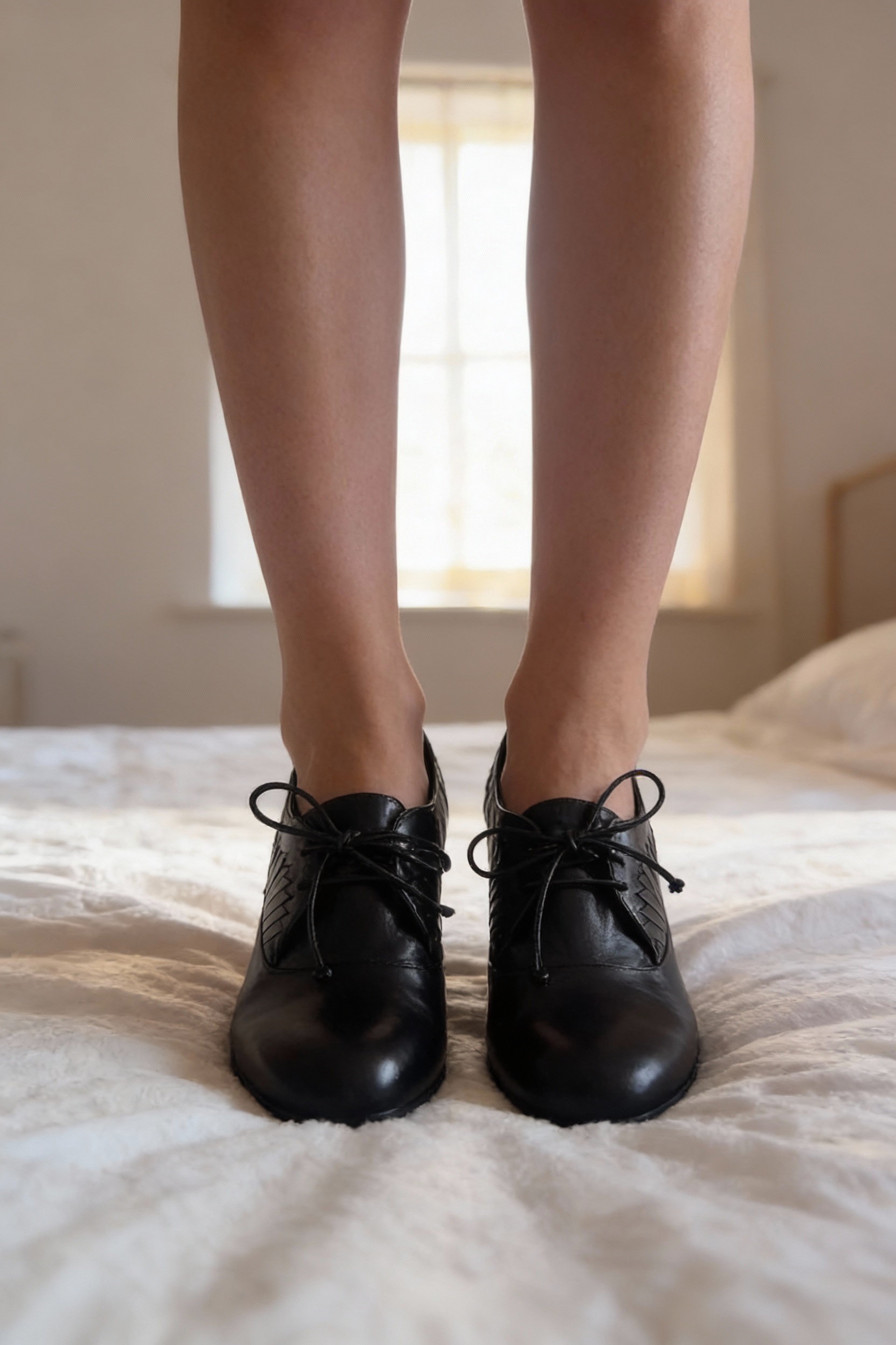 Bottine Michel Vivien debout, face à la caméra, dans une chambre à la lumière douce, avec une lumière naturelle filtrant par la fenêtre.