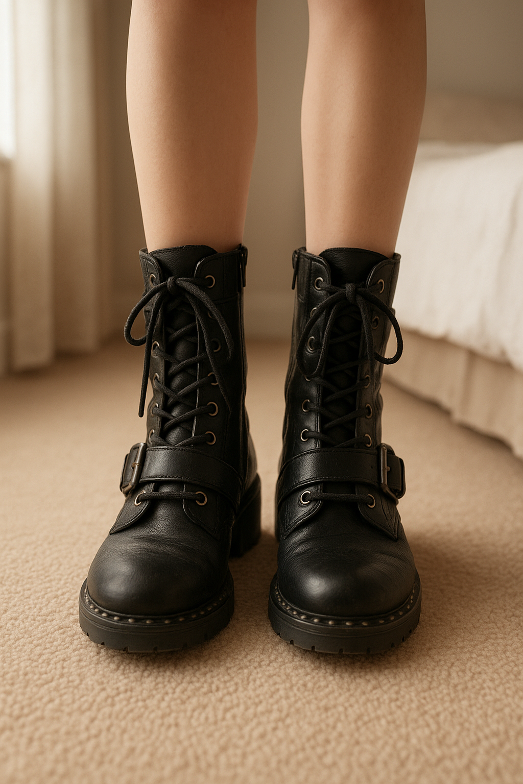 Bottines femme debout, face à la caméra, dans une chambre à la lumière douce, avec une lumière naturelle filtrant par la fenêtre.