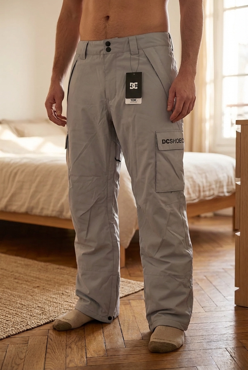 Brand new men’s DC ski pants size XL debout, face à la caméra, dans une chambre à la lumière douce, avec une lumière naturelle filtrant par la fenêtre.
