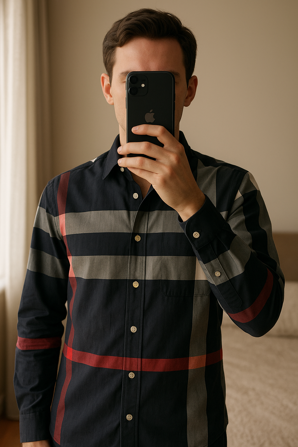 Burberry chemise debout, face à la caméra, dans une chambre à la lumière douce, avec une lumière naturelle filtrant par la fenêtre.