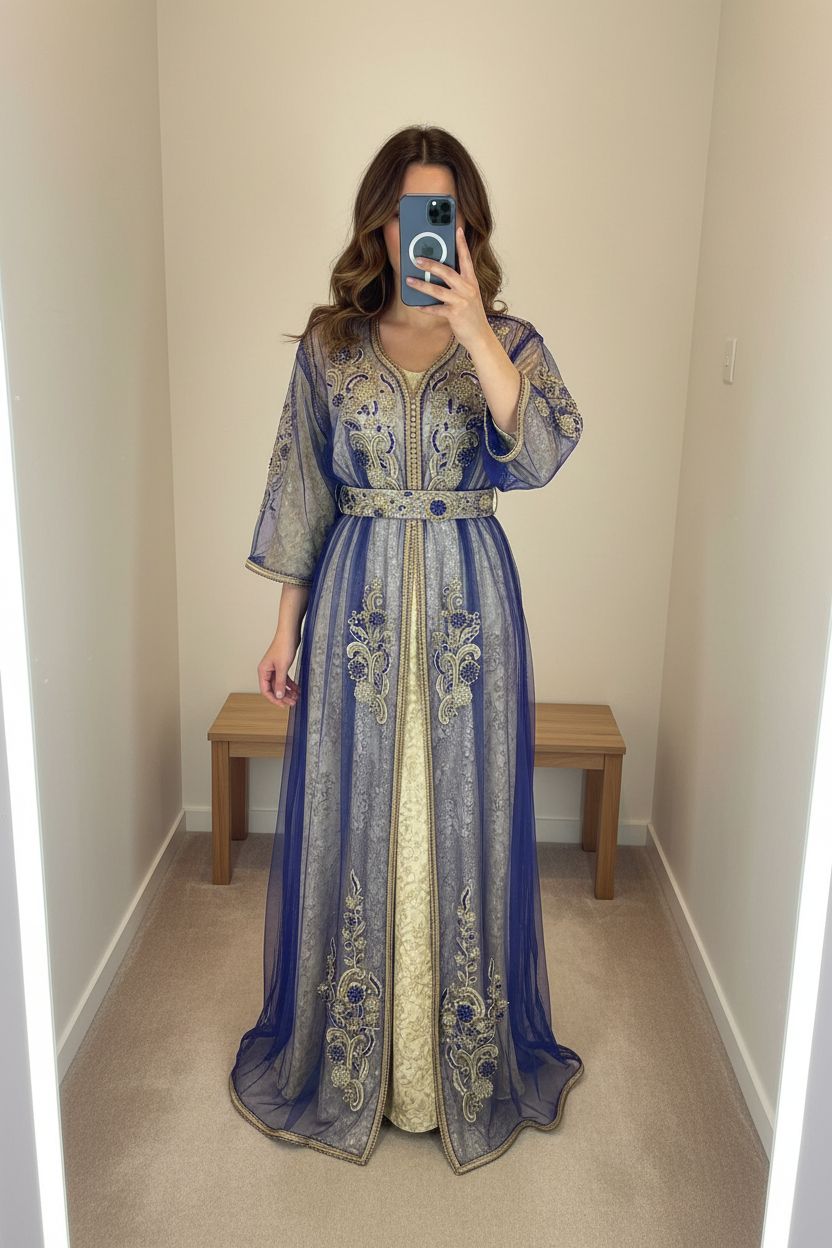 Une personne en Caftan bleu et doré brodé chic avec ceinture décorée debout, face à la caméra, dans une cabine d’essayage de style boutique avec un miroir et une décoration neutre.
