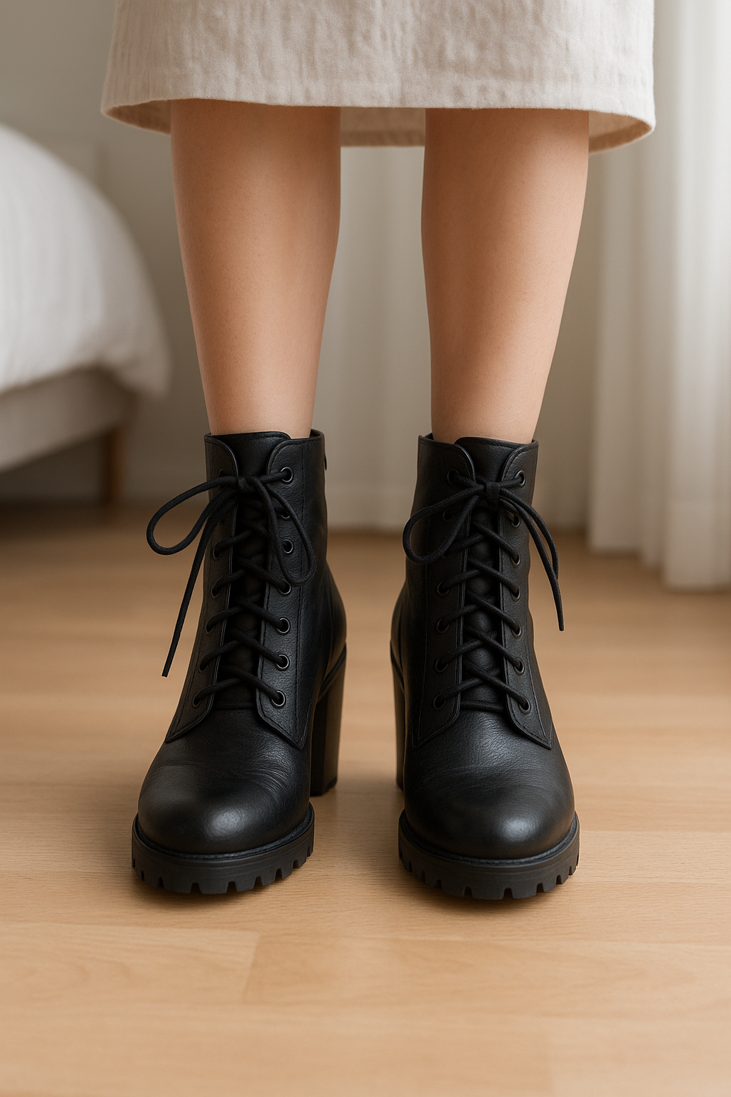 Calvin Klein Schnürstiefel aufrecht stehend, der Kamera zugewandt, in einem sanft beleuchteten Schlafzimmer, mit natürlichem Licht, das durch ein Fenster fällt.