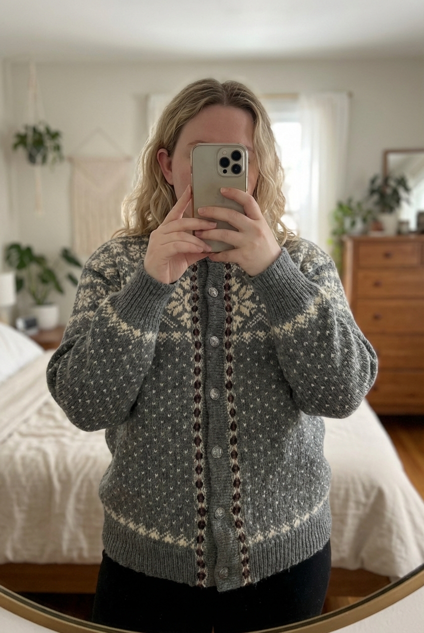 Une personne en Cardigan Dale Of Norway Norvegian Made in Norway Pewter clasp Fait Main Tricot 100% Laine Gris L/XL debout, face à la caméra, avec une silhouette légèrement plus ronde, dans une chambre à la lumière douce, avec une lumière naturelle filtrant par la fenêtre.