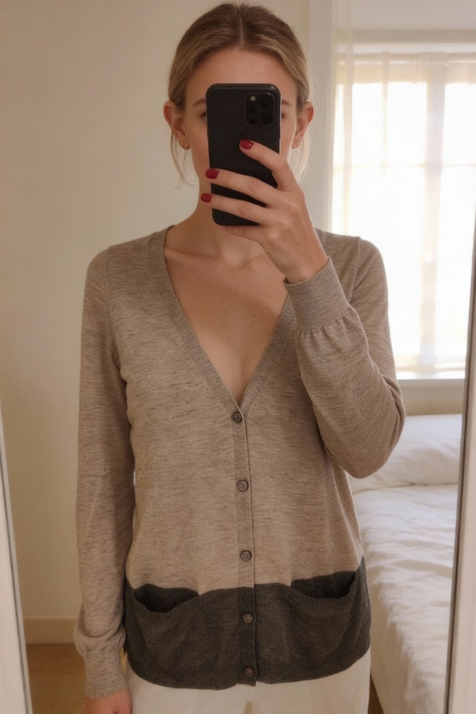 Cardigan in silk & lana wool Marella debout, face à la caméra, dans une chambre à la lumière douce, avec une lumière naturelle filtrant par la fenêtre.
