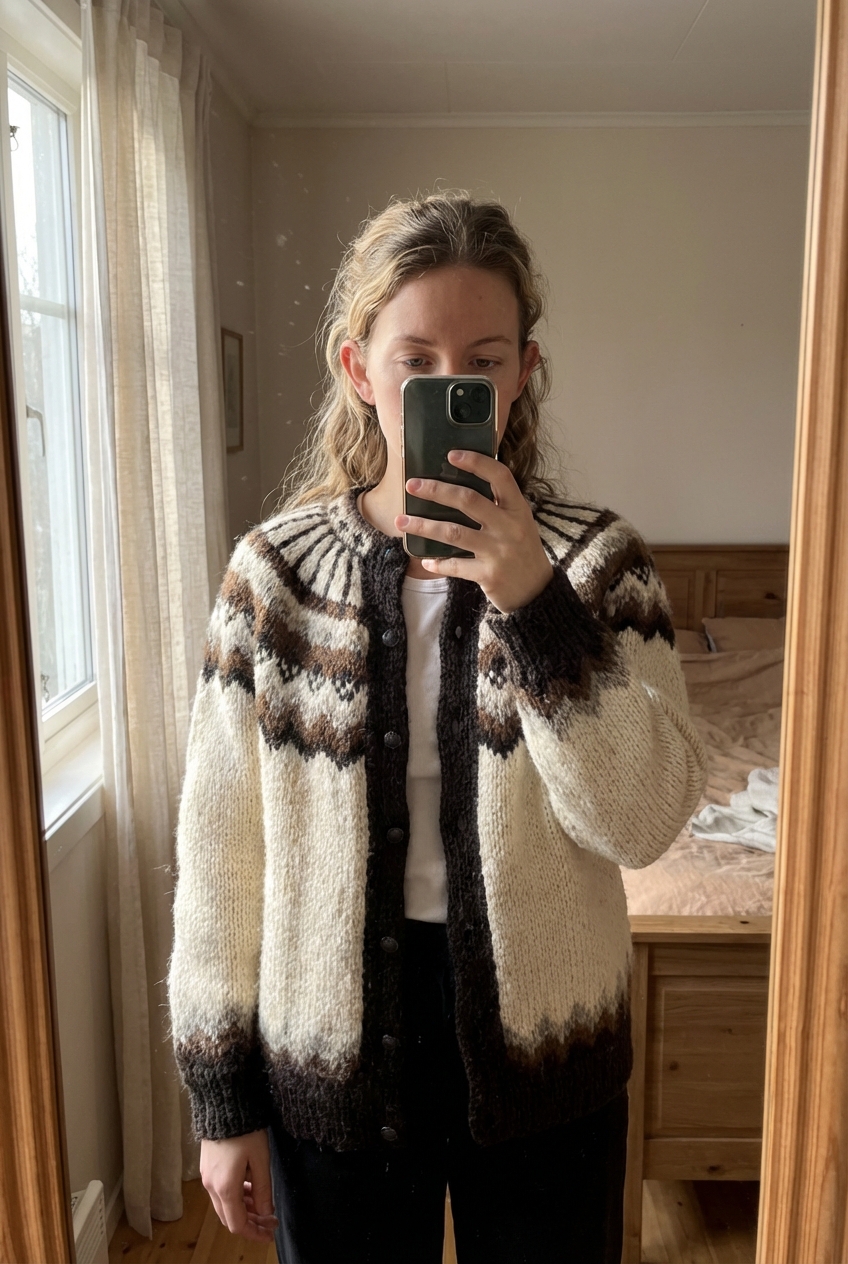 Cardigan Nordique Iceland Sweater Fait Main Tricot Made in Iceland IceWool 100% Laine Crème XL debout, face à la caméra, dans une chambre à la lumière douce, avec une lumière naturelle filtrant par la fenêtre.