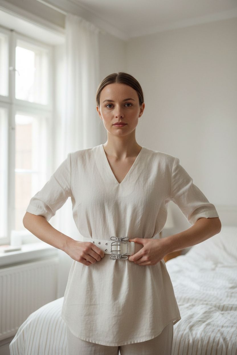 Une personne en Ceinture cuir blanche Claudie Pierlot T1 neuf debout, face à la caméra, avec une silhouette fine, dans une chambre à la lumière douce, avec une lumière naturelle filtrant par la fenêtre.