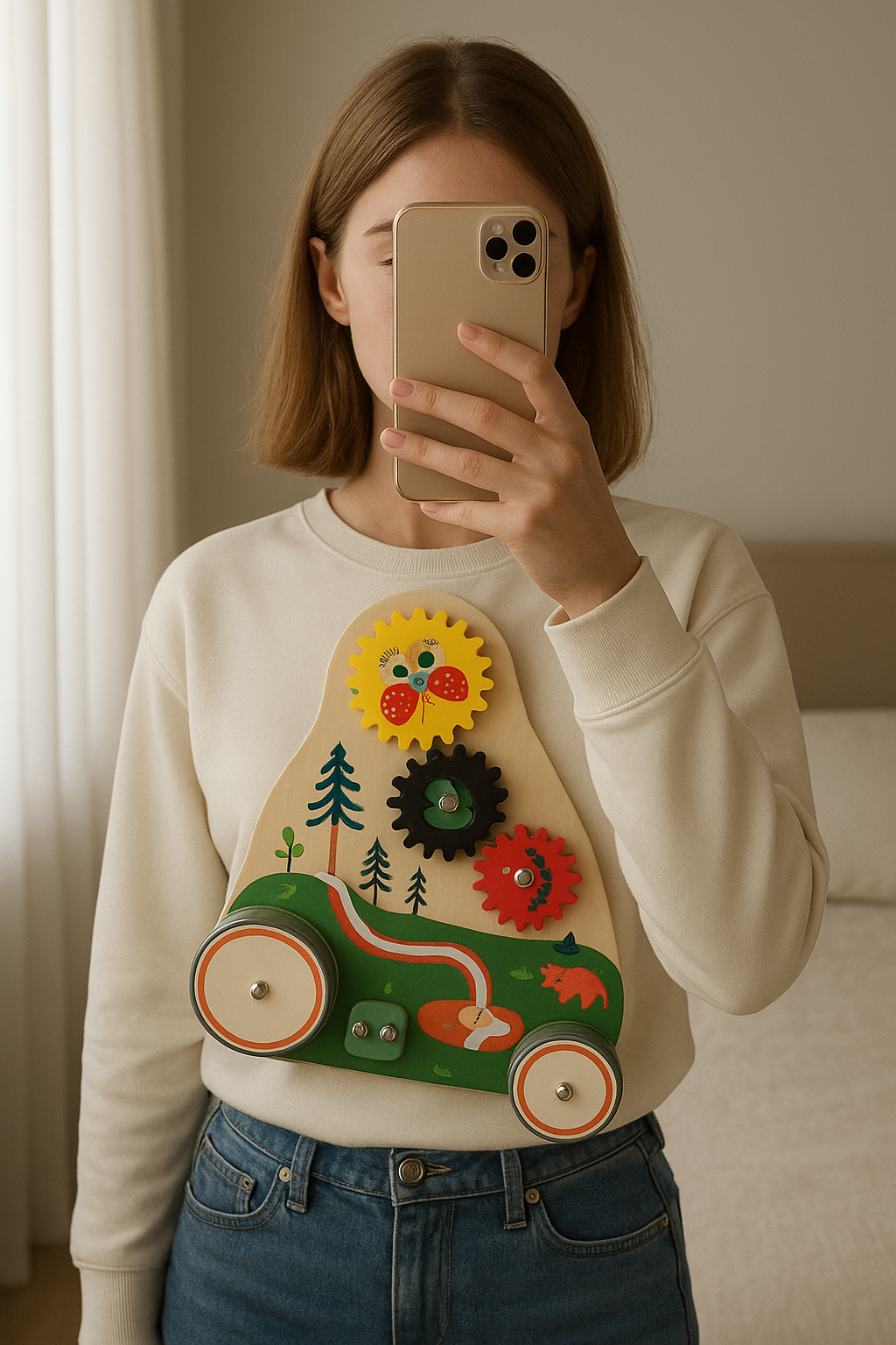 Chariot de marche debout, face à la caméra, dans une chambre à la lumière douce, avec une lumière naturelle filtrant par la fenêtre.
